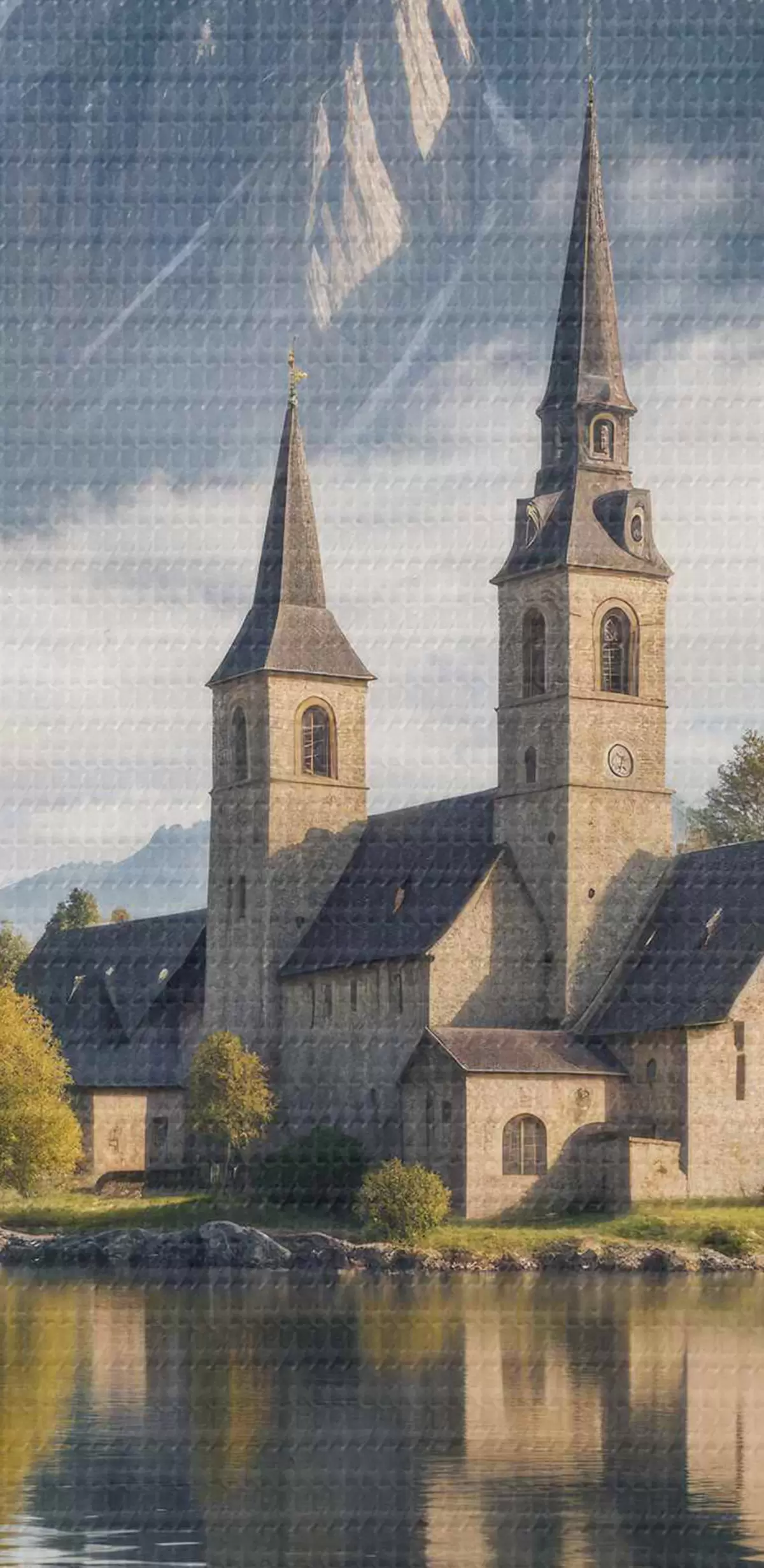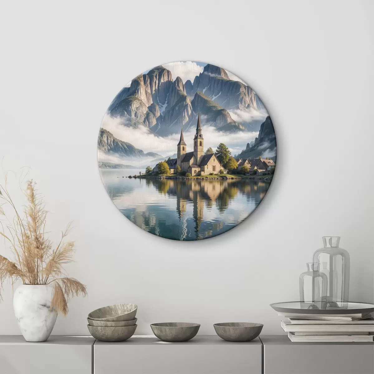 Tableaux rondes Un village alpin pittoresque situé au bord d'un lac tranquille et surplombé de montagnes enneigées r40554