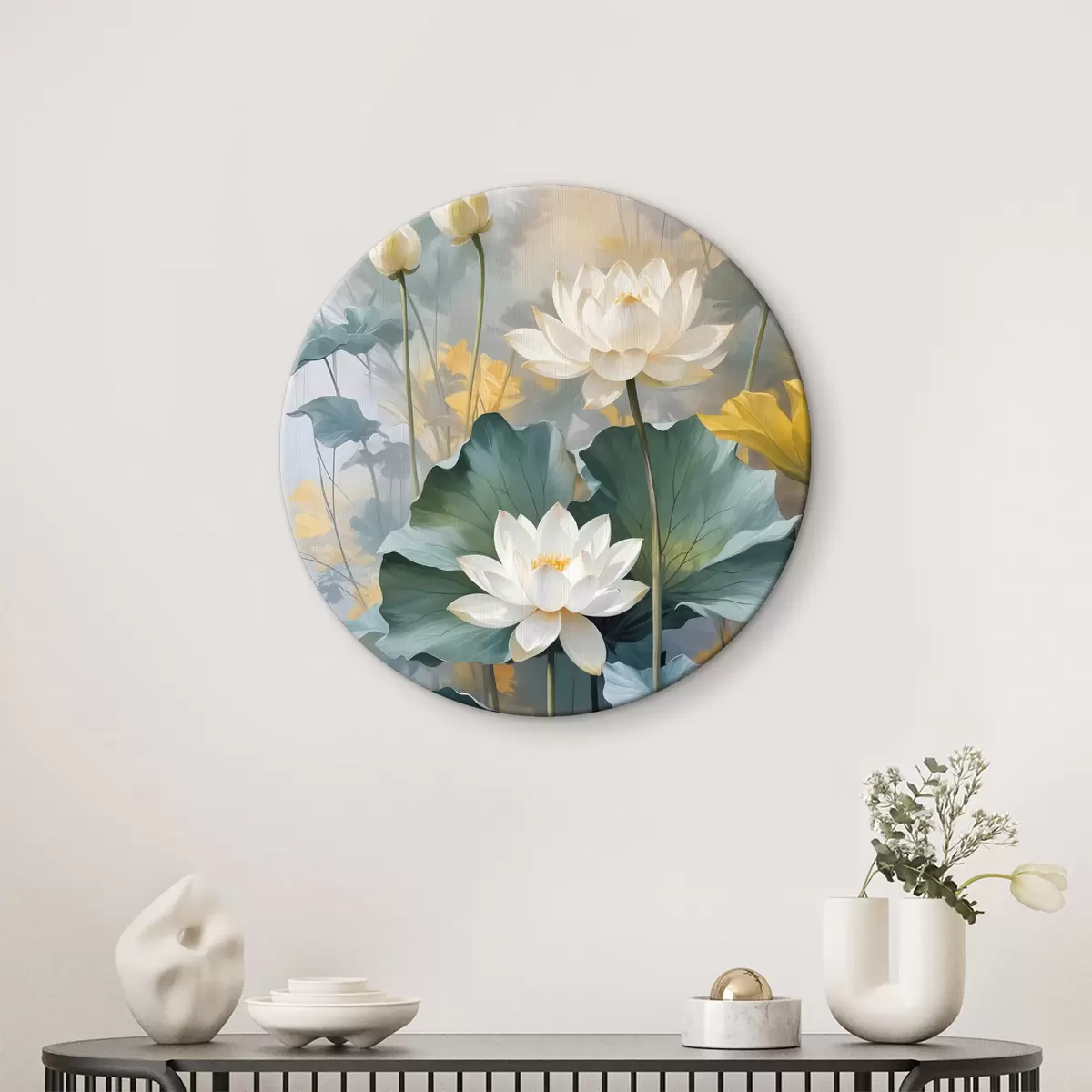 Tableaux rondes Fleurs de lotus blanches dans un étang avec des pétales de nénuphars verts, entourées de fleurs jaunes et d'un arrière-plan flou r40559