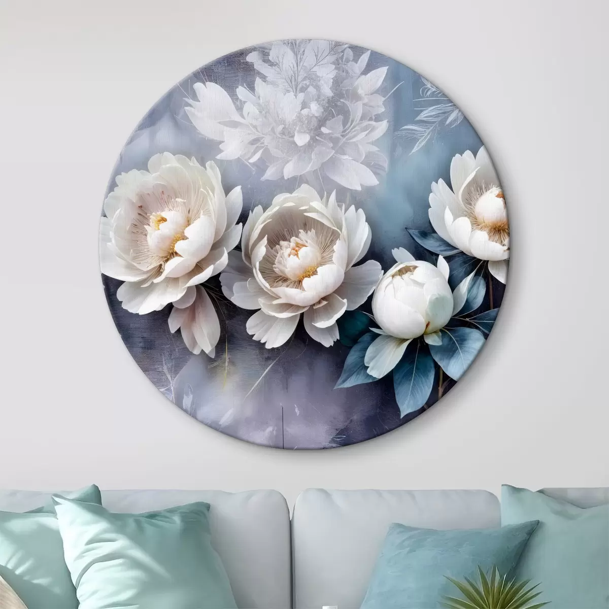 Tableaux rondes Fleurs de pivoine blanches avec des feuilles vertes sur un fond texturé bleu Nr r40569