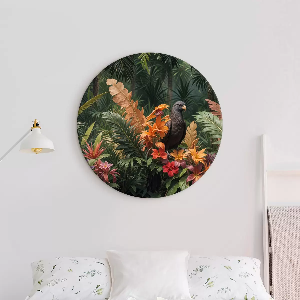 Tableaux rondes Oiseau tropical assis sur une branche entouré d'une végétation luxuriante, de feuilles de palmier, de fleurs et de plantes exotiques Nr r40578