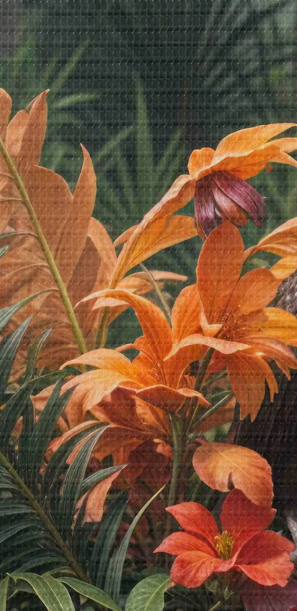 Tableaux rondes Oiseau tropical assis sur une branche entouré d'une végétation luxuriante, de feuilles de palmier, de fleurs et de plantes exotiques r40578