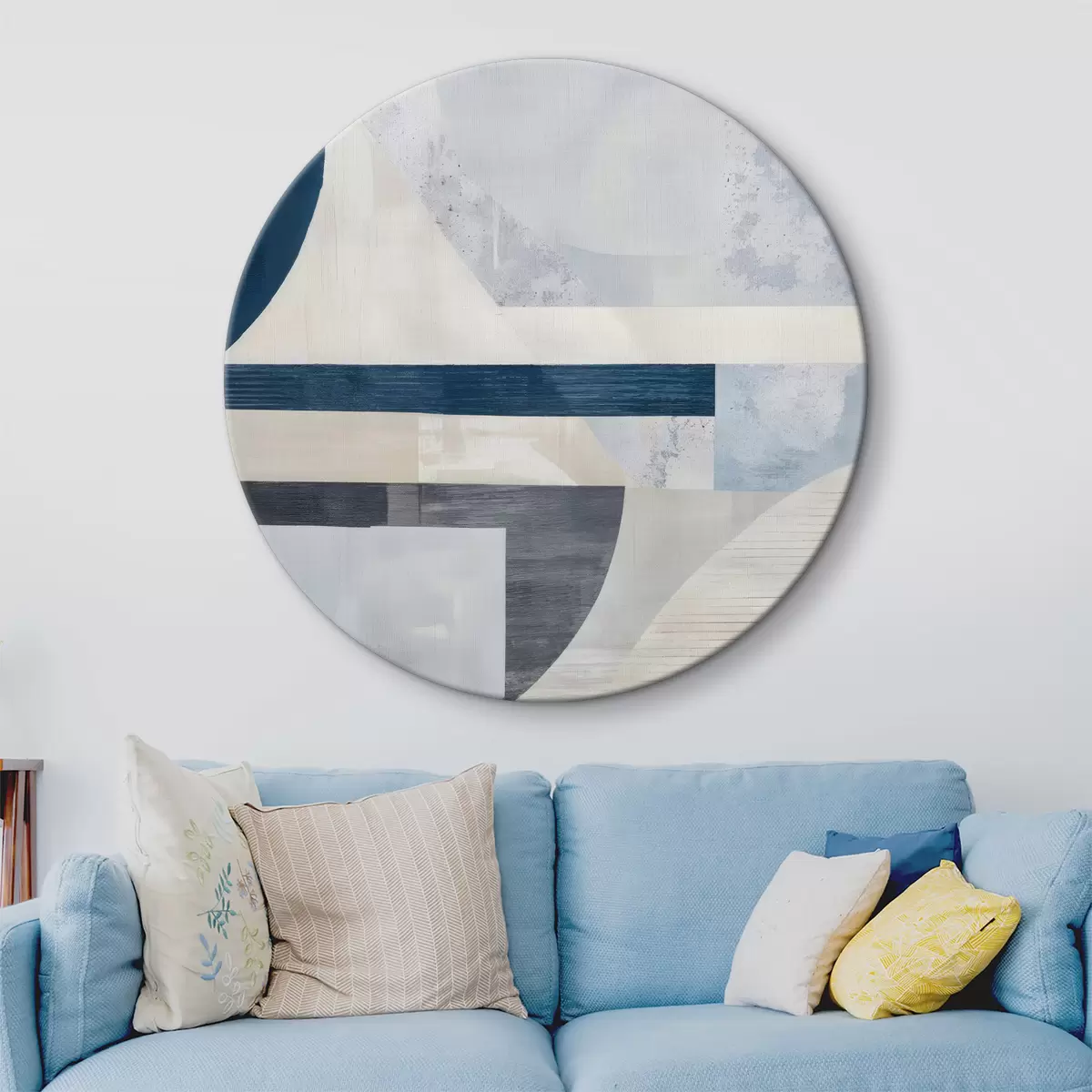 Tableaux rondes Abstraction minimaliste avec des formes géométriques et des textures dans des tons de bleu, de gris et de blanc r40596