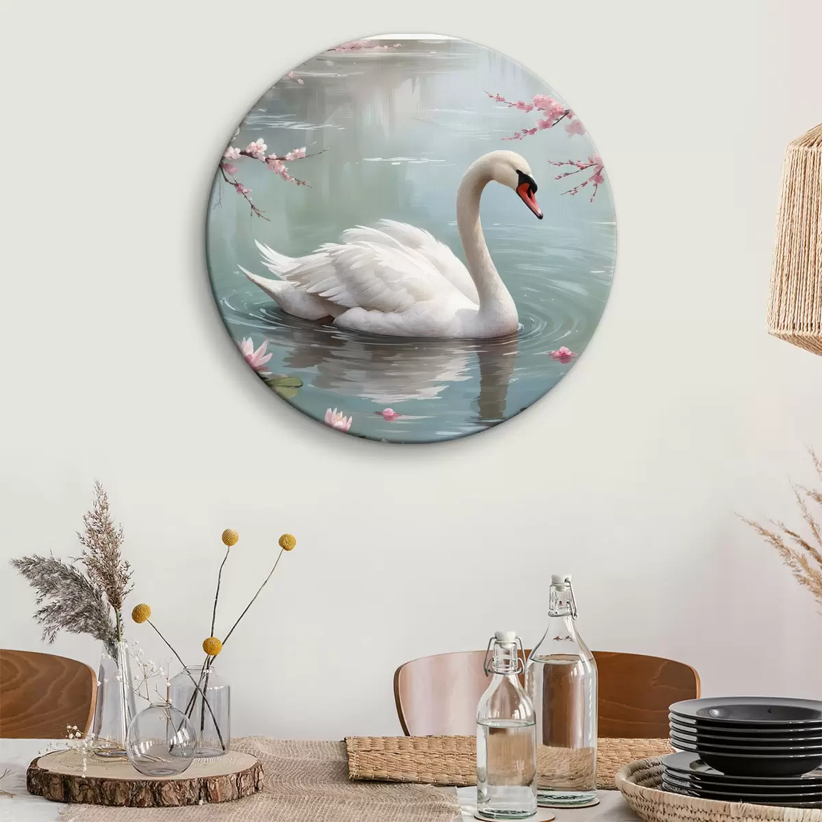 Tableaux rondes Gracieux cygne blanc nageant dans un étang calme entouré de cerisiers roses en fleurs Nr r40597