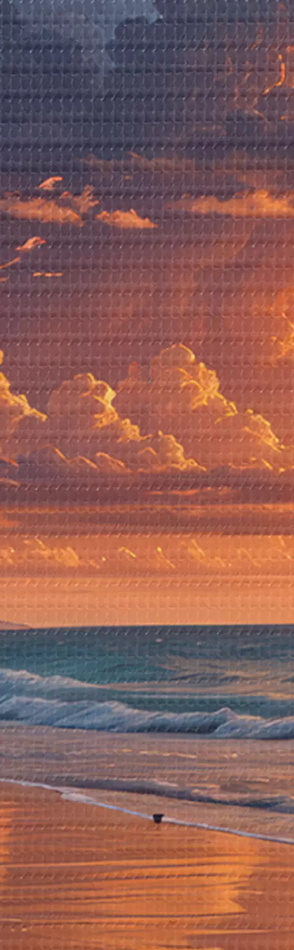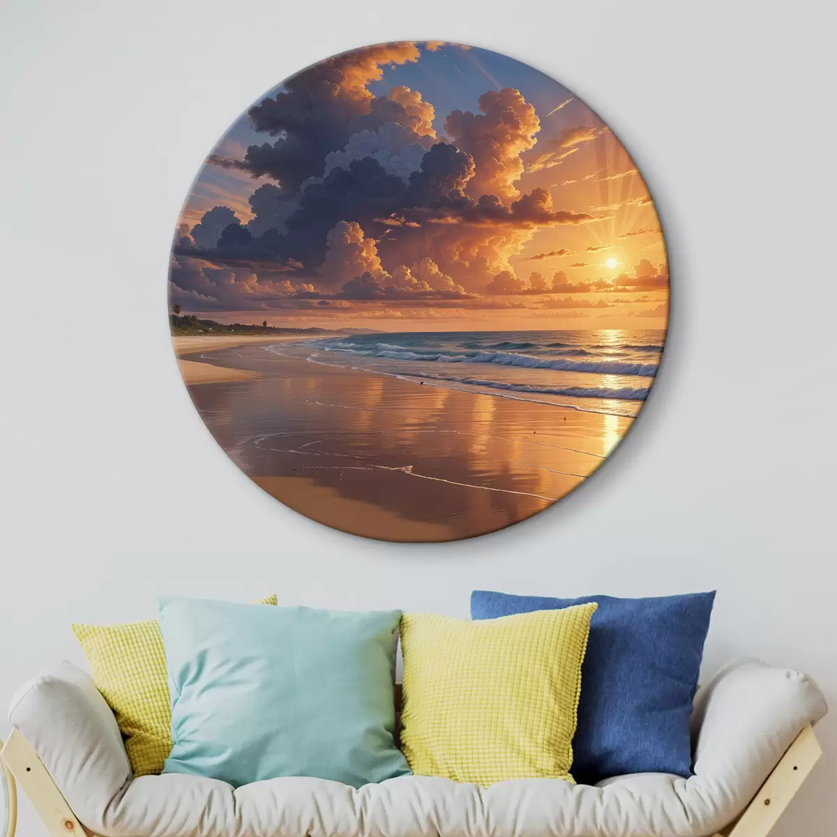 Tableaux rondes Coucher de soleil spectaculaire sur une plage tropicale, avec des nuages orange et roses se reflétant dans les eaux calmes Nr r40599