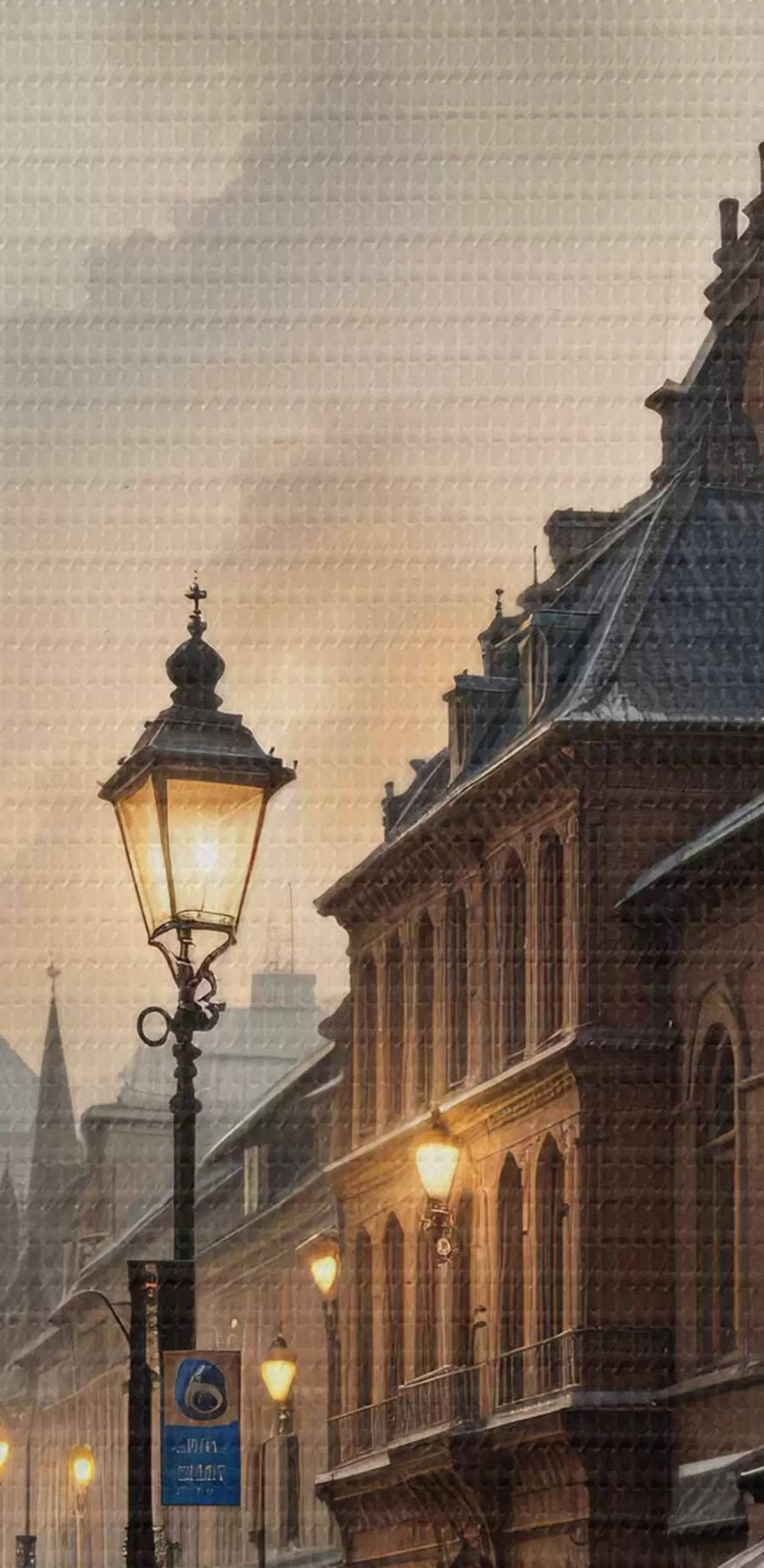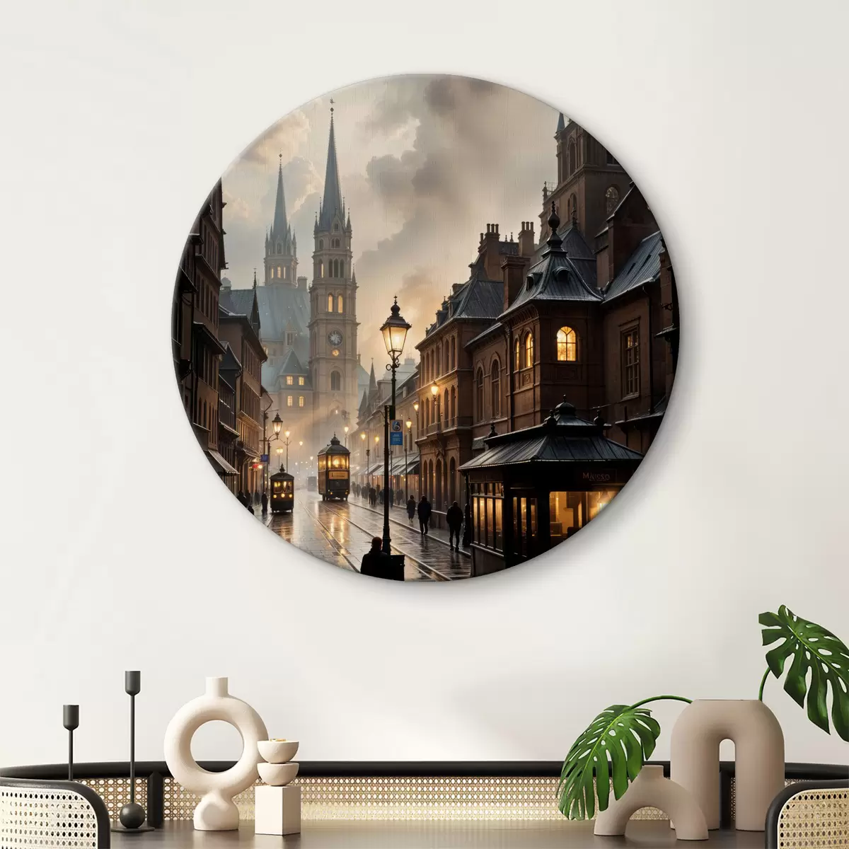 Tableaux rondes Soirée pluvieuse dans une vieille ville européenne, avec des rues pavées, des bâtiments historiques et un tramway qui passe Nr r40604
