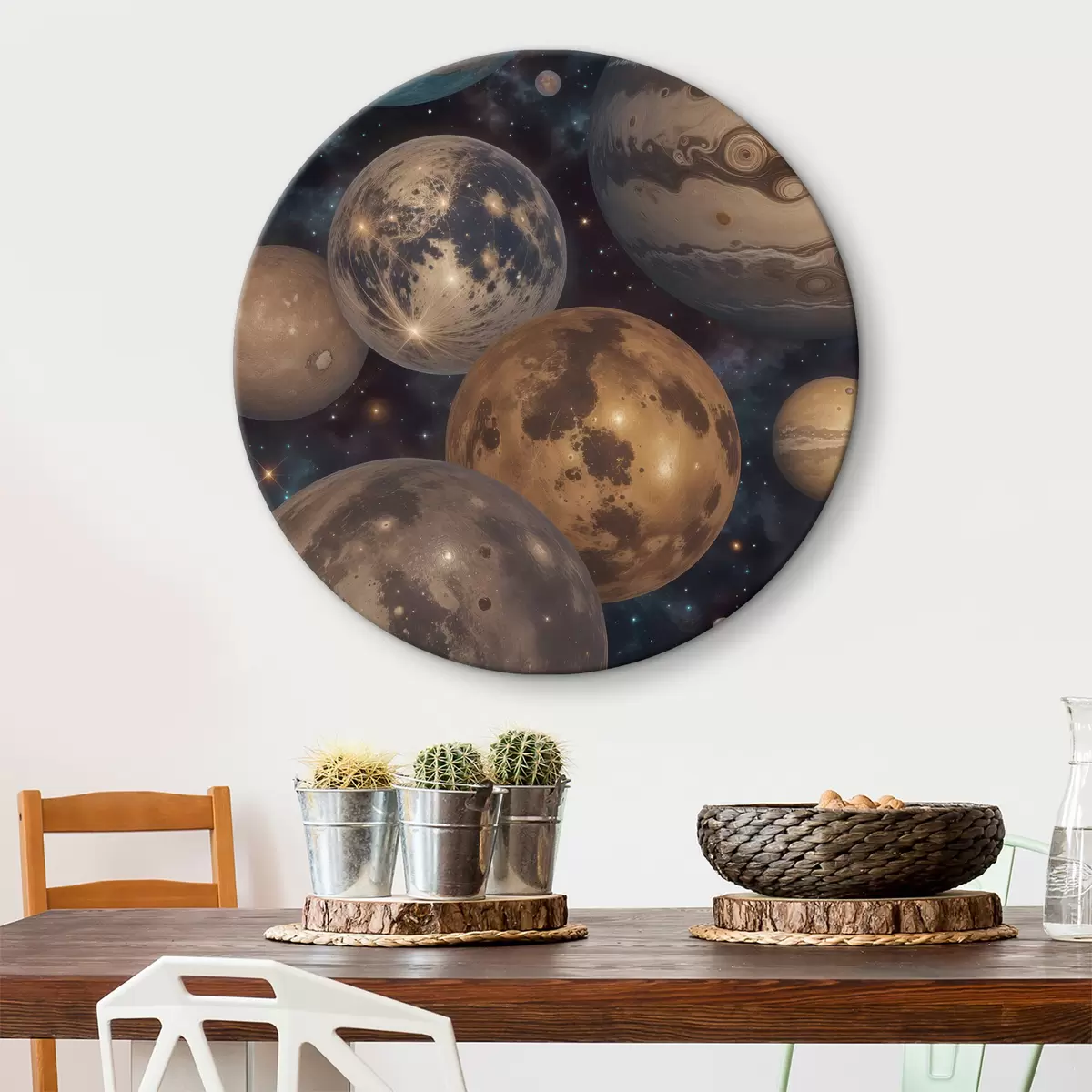 Tableaux rondes Impression abstraite de l'espace avec des planètes et des lunes colorées flottant dans le ciel étoilé Nr r40607