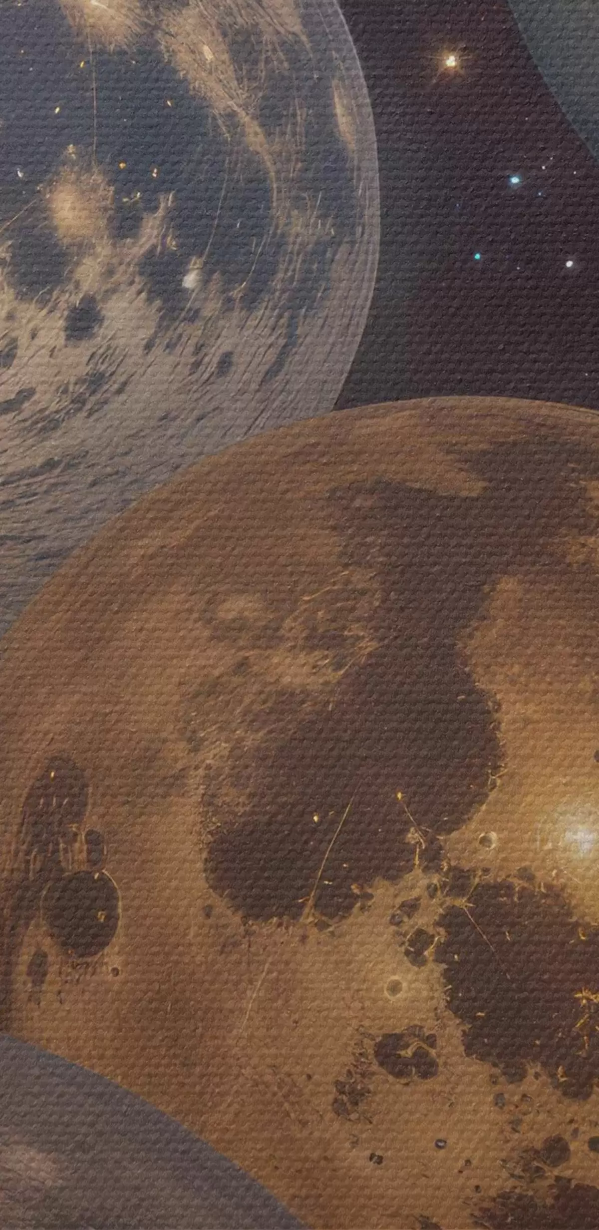 Tableaux rondes Impression abstraite de l'espace avec des planètes et des lunes colorées flottant dans le ciel étoilé r40607