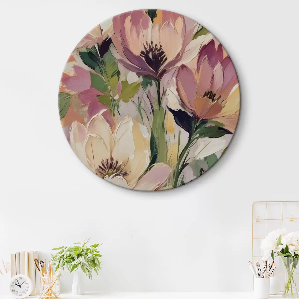 Tableaux rondes Une composition florale vibrante avec de grandes fleurs colorées dans les tons de rose, pêche et jaune Nr r40609