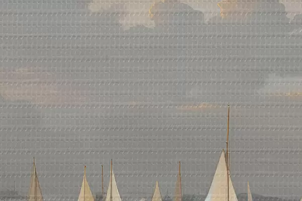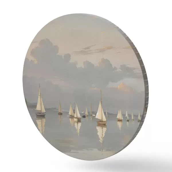Tableaux rondes Une flotte de voiliers blancs sur un plan d'eau calme et réfléchissant au coucher du soleil, avec un ciel nuageux en arrière-plan Nr r40615
