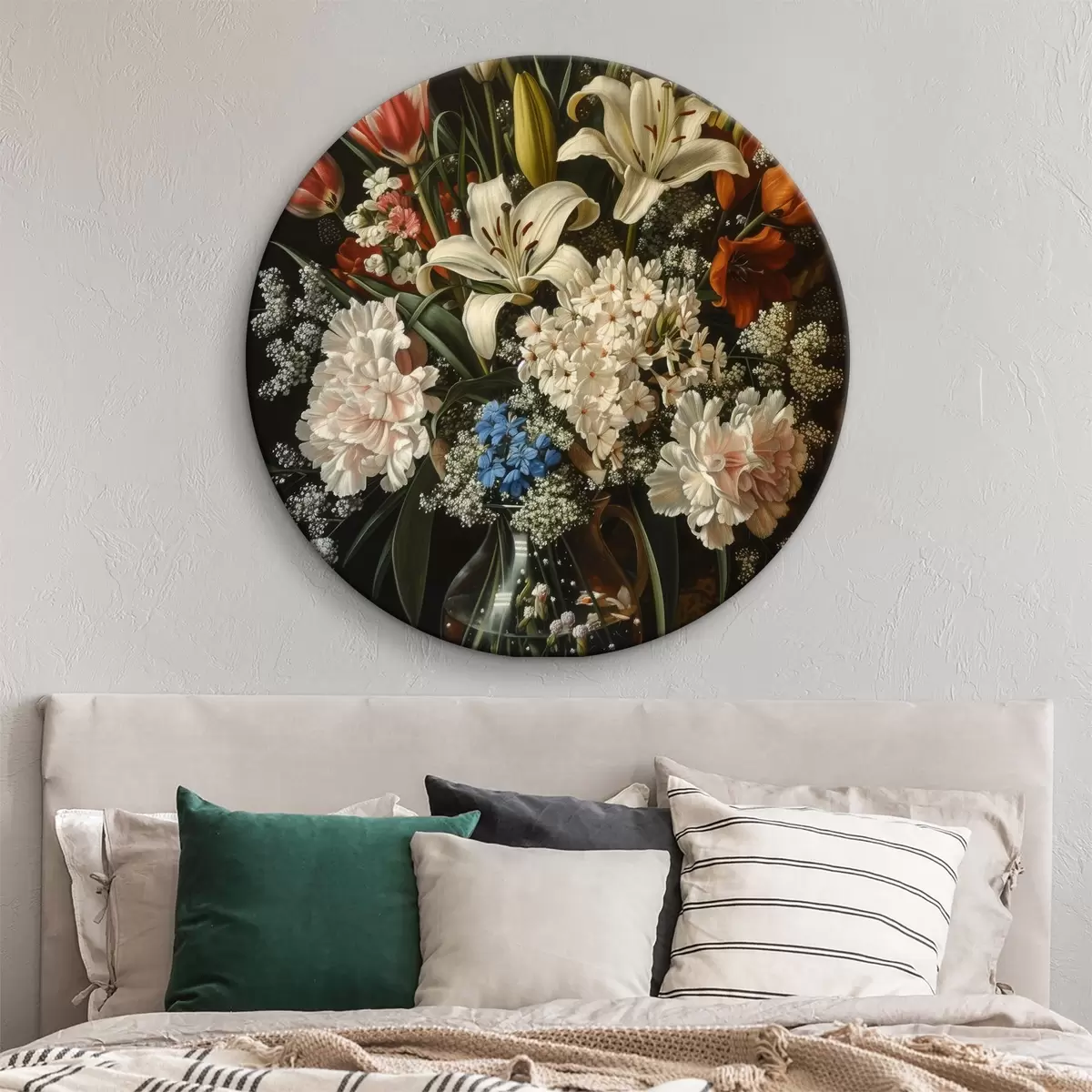 Tableaux rondes Nature morte baroque avec un vase rempli de tulipes, d'œillets et de jacinthes, imitation d'une peinture à l'huile r40659
