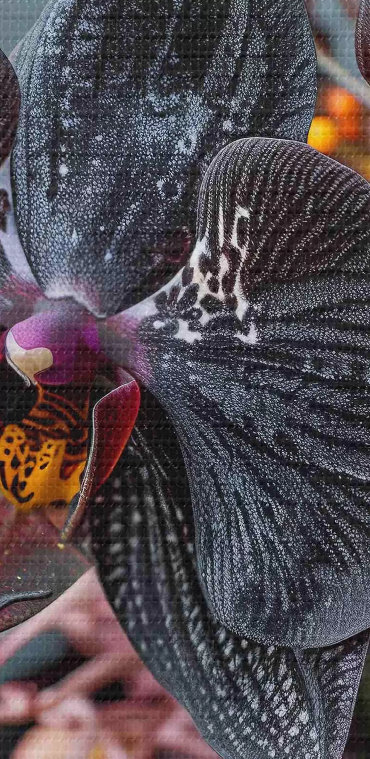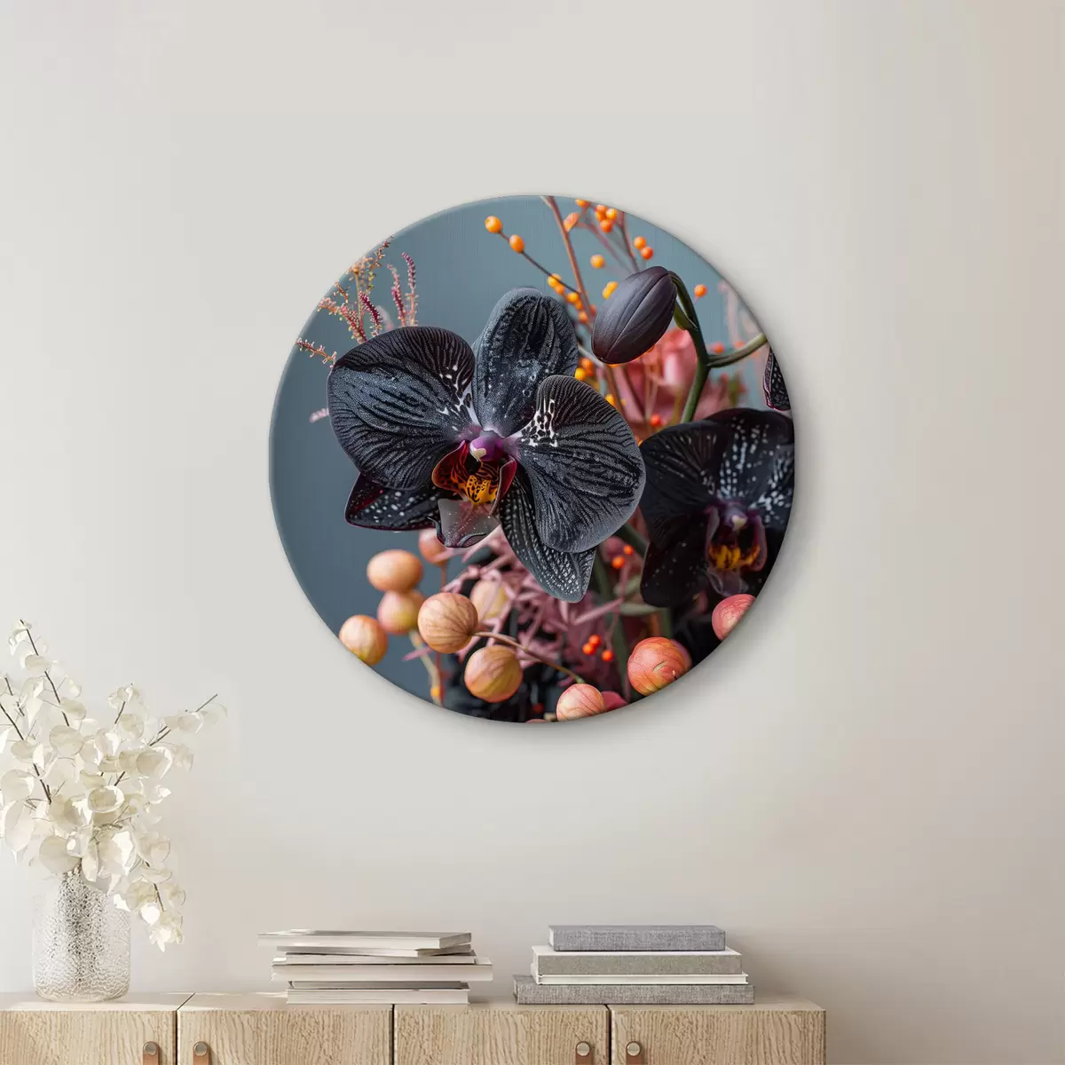 Tableaux rondes Arrangement floral élégant avec orchidée noire et autres plantes Nr r40662