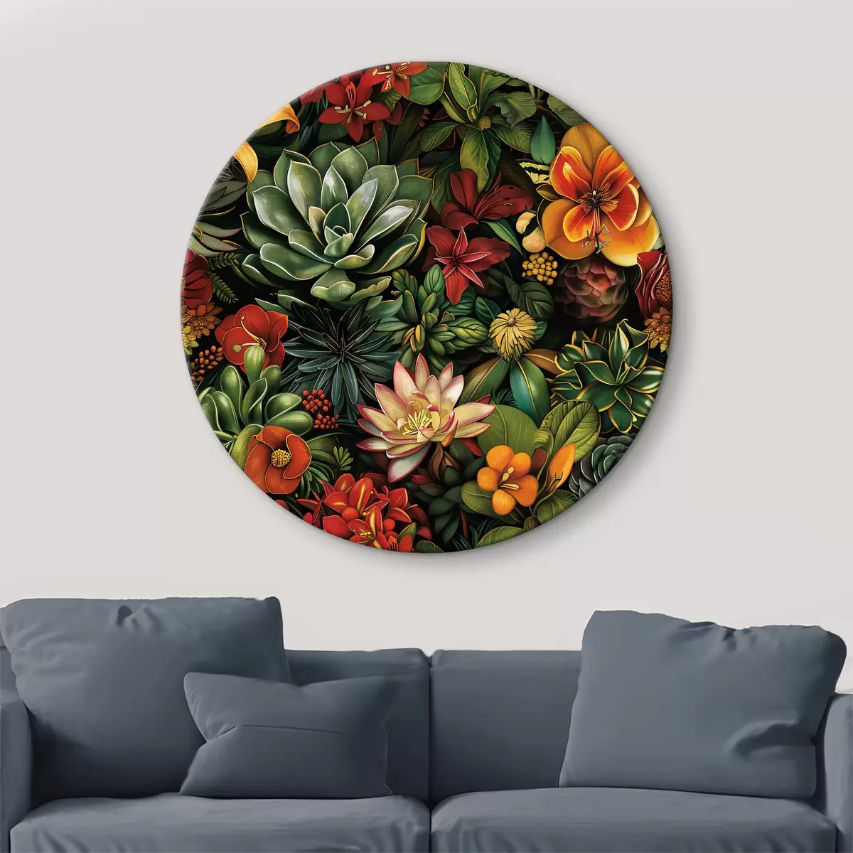 Tableaux rondes Jardin luxuriant avec plantes grasses et fleurs tropicales r40666