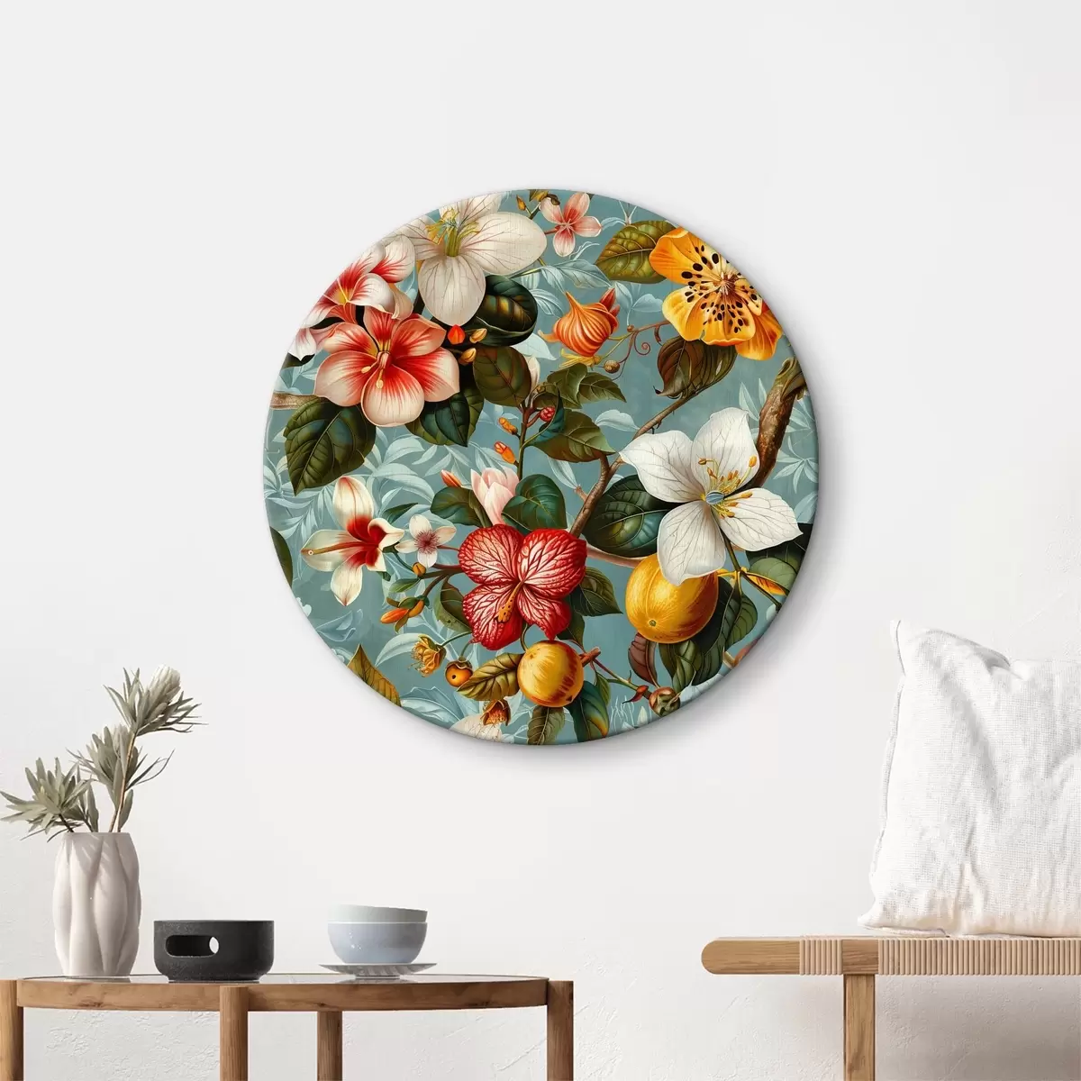 Tableaux rondes Composition de verdure et de fleurs tropicales sur fond bleu Nr r40668