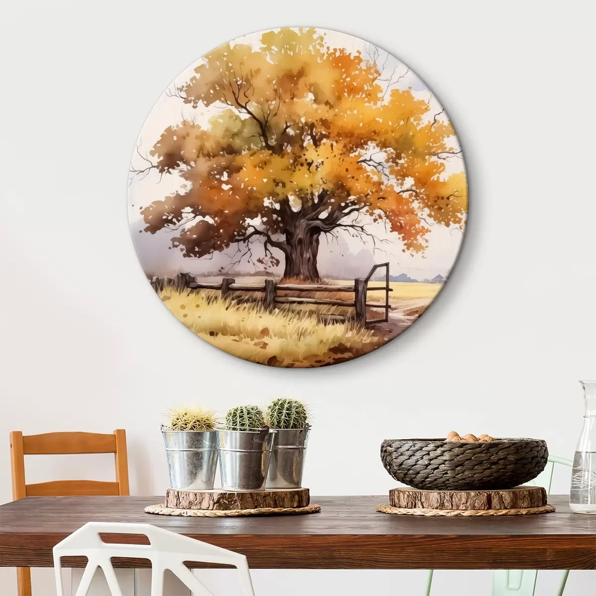 Tableaux rondes Arbre dans le champ près de la clôture avec des feuilles jaunies, paysage d'automne Nr r40680