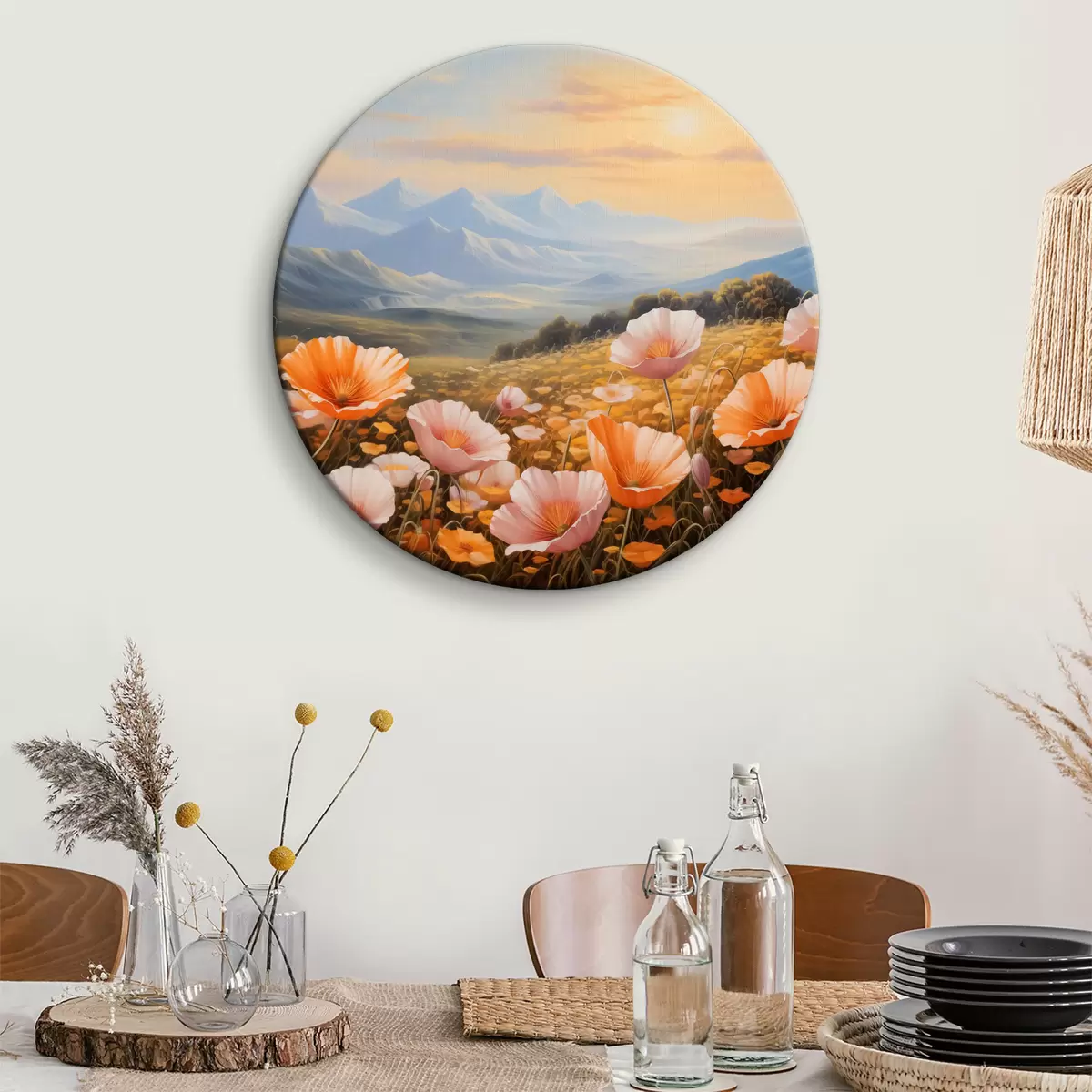 Tableaux rondes Champ de coquelicots à l'aube avec les montagnes en arrière-plan Nr r40730