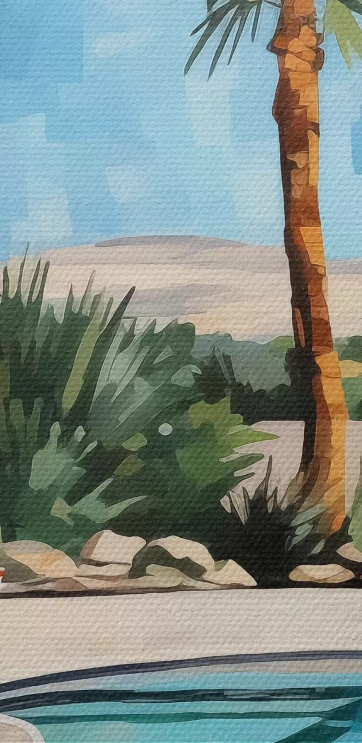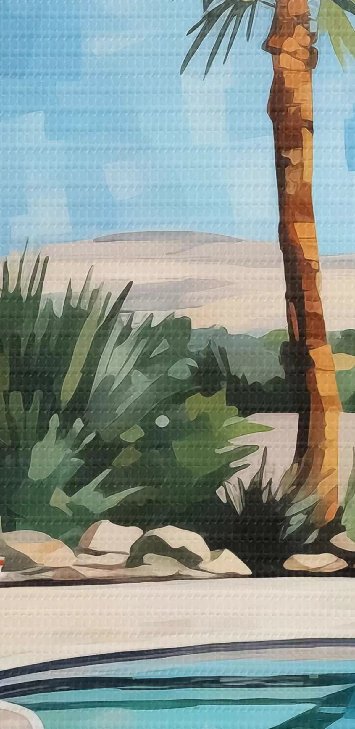 Tableaux rondes Palmiers près de l'hôtel avec une piscine près des rochers, couleurs bleu, vert, rouge Nr r40748