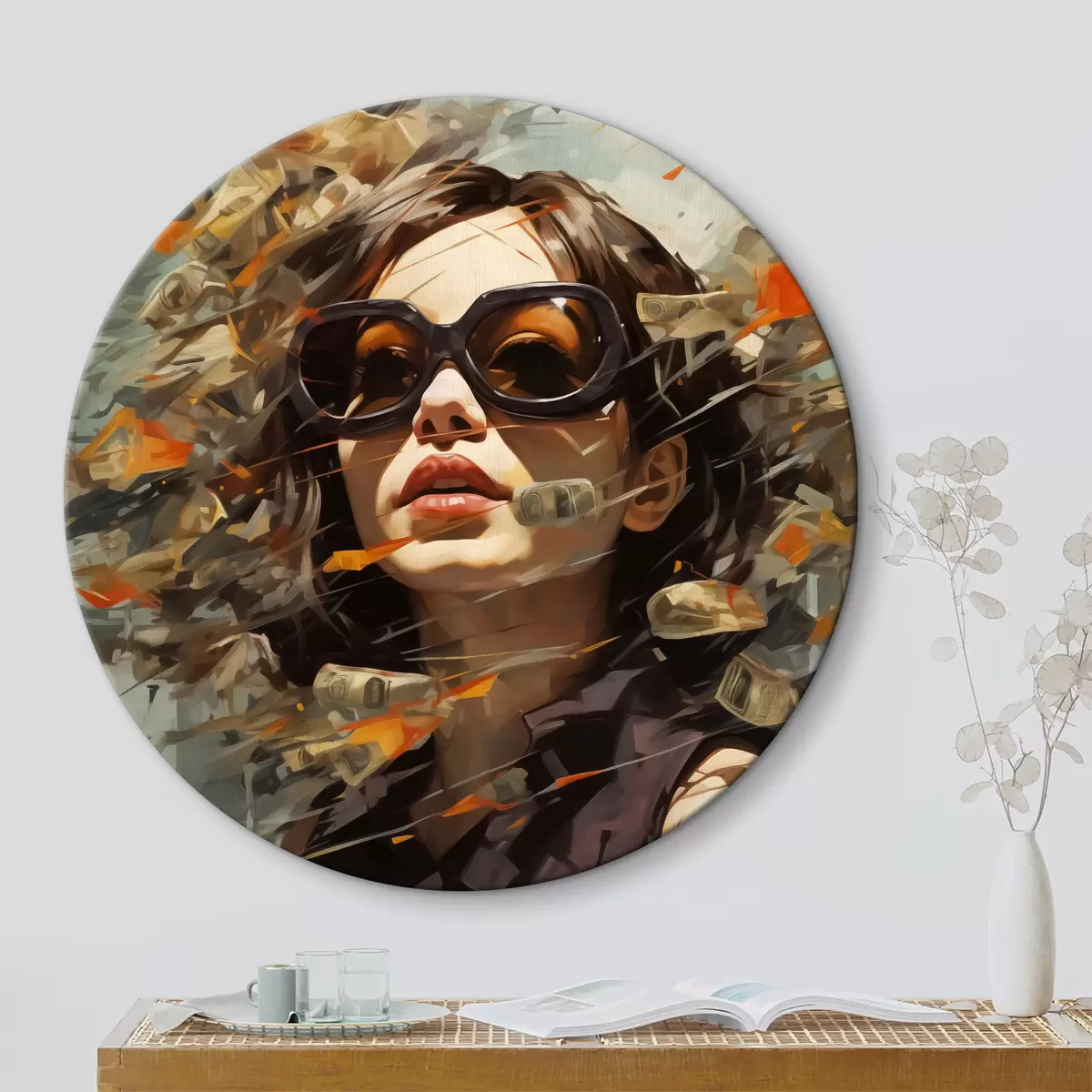 Tableaux rondes Fille avec des lunettes de soleil entourée d'argent abstrait r40750