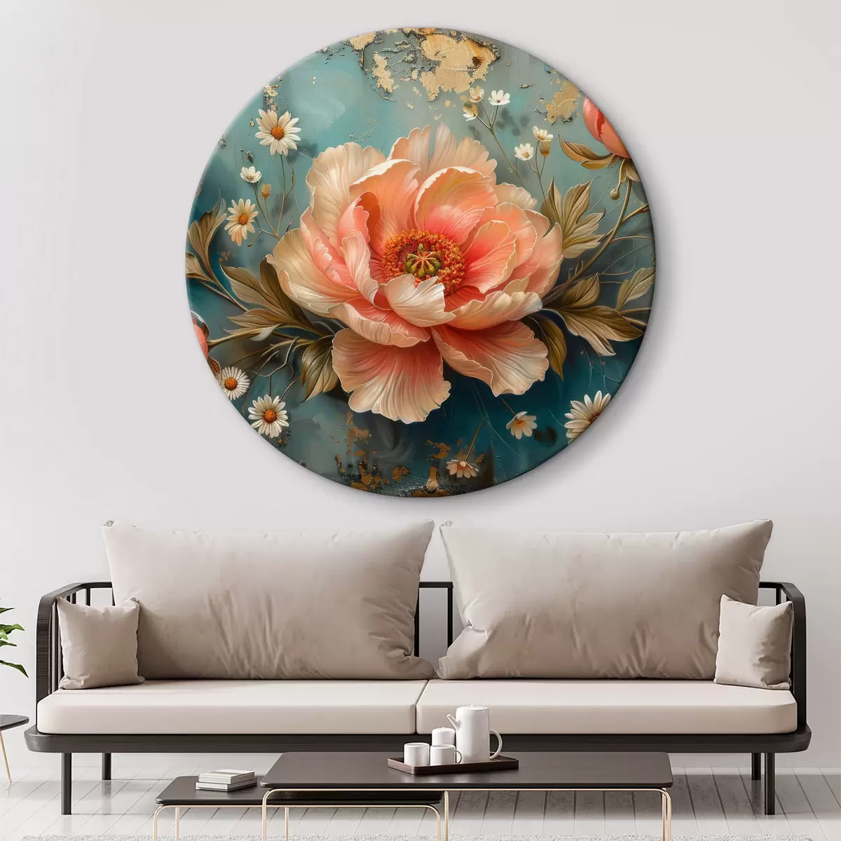 Tableaux rondes Rose, fond turquoise, petites fleurs Nr r40781