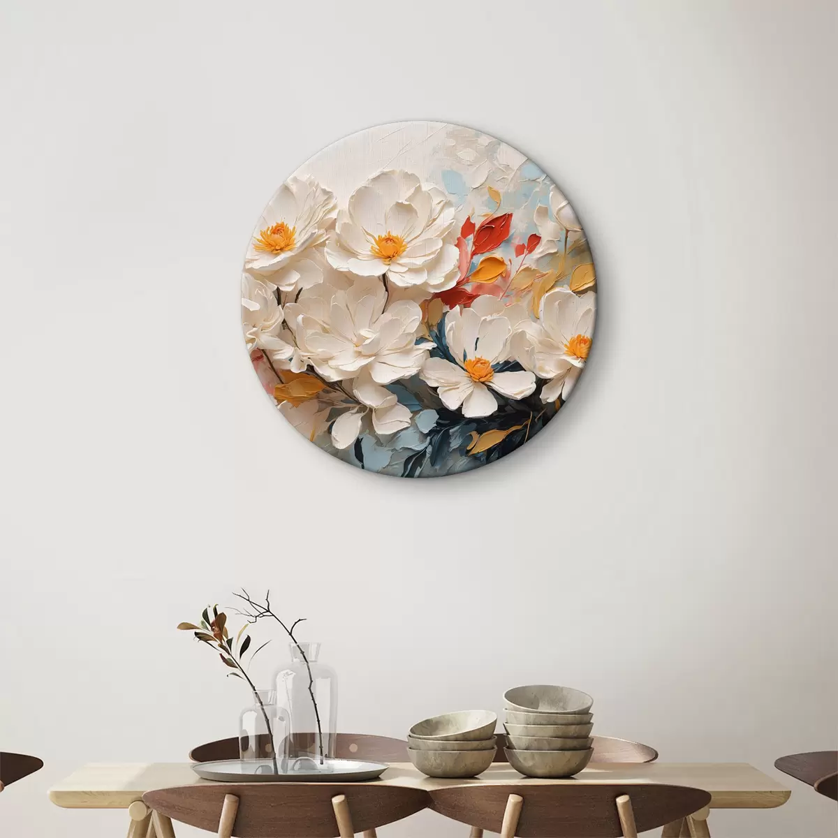 Tableaux rondes Fleurs blanches abstraites à l'huile r40862