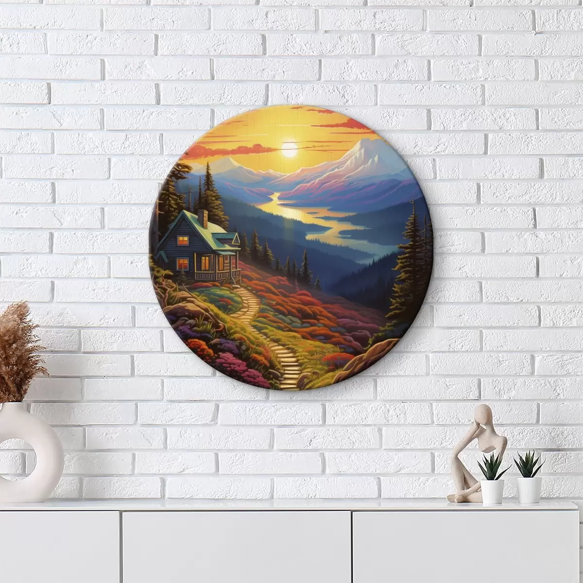 Tableaux rondes Paysage coloré avec montagnes et maison en bois, couleurs du coucher de soleil Nr r40941