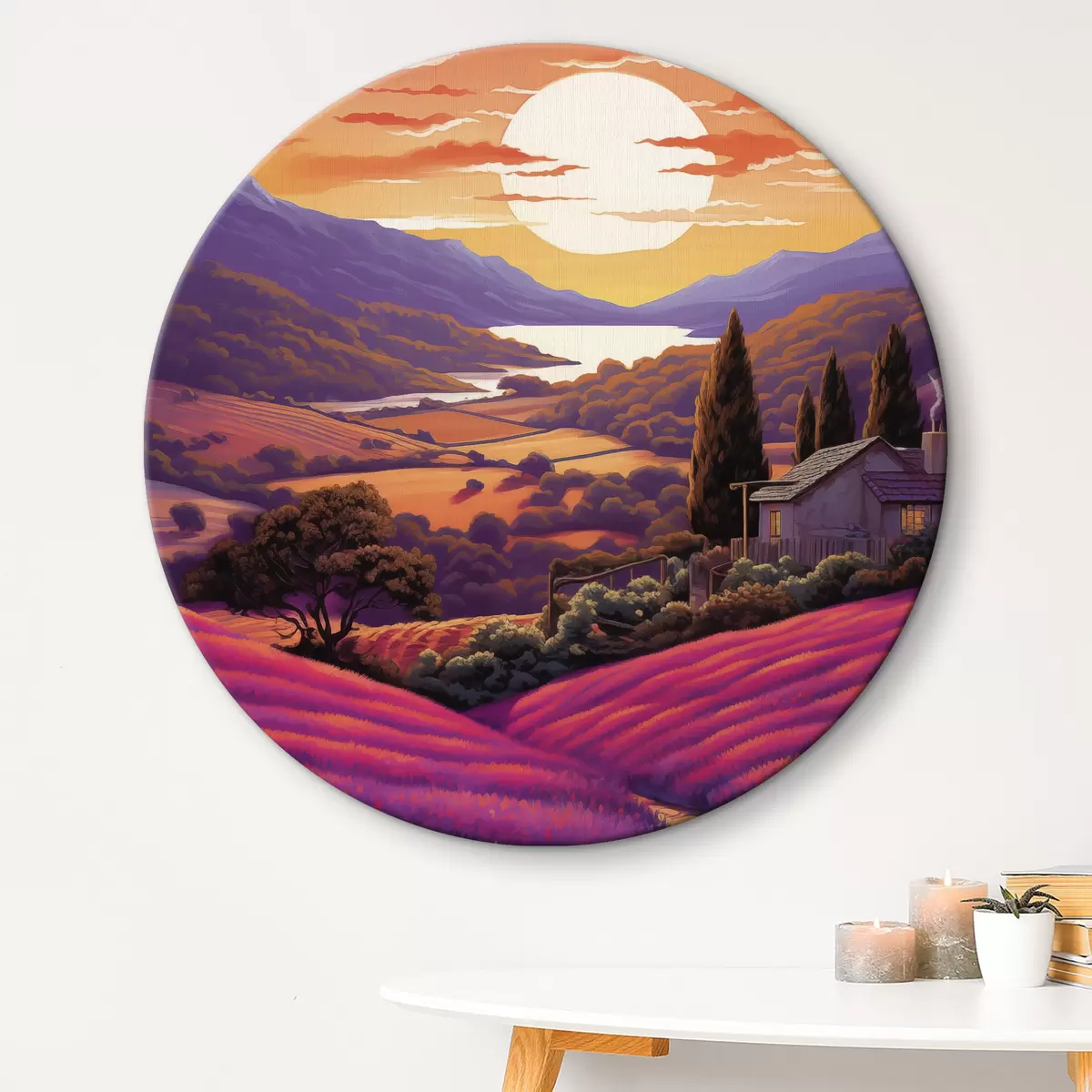 Tableaux rondes Champs de lavande, coucher de soleil, beaux paysages, montagnes Nr r40943