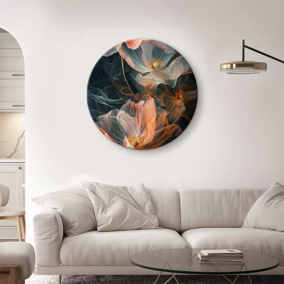 Tableaux rondes Fleurs lumineuses et translucides enveloppées de fumée sur un fond sombre Nr r40968