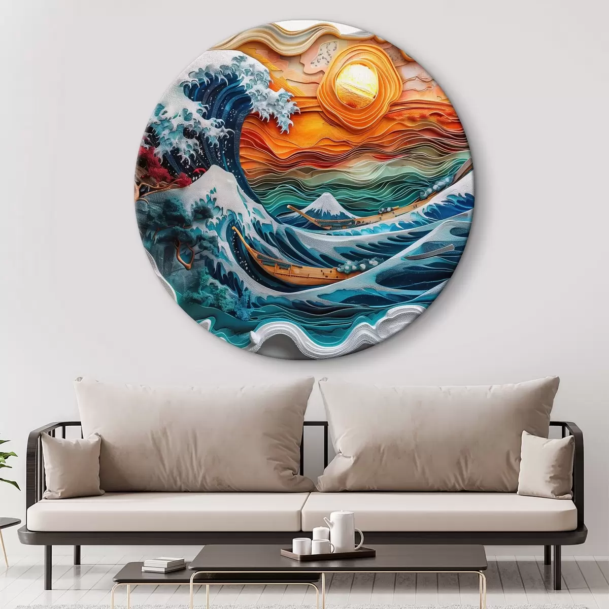 Tableaux rondes Imitation d'un bas-relief : un océan déchaîné avec des bateaux et le soleil r40976