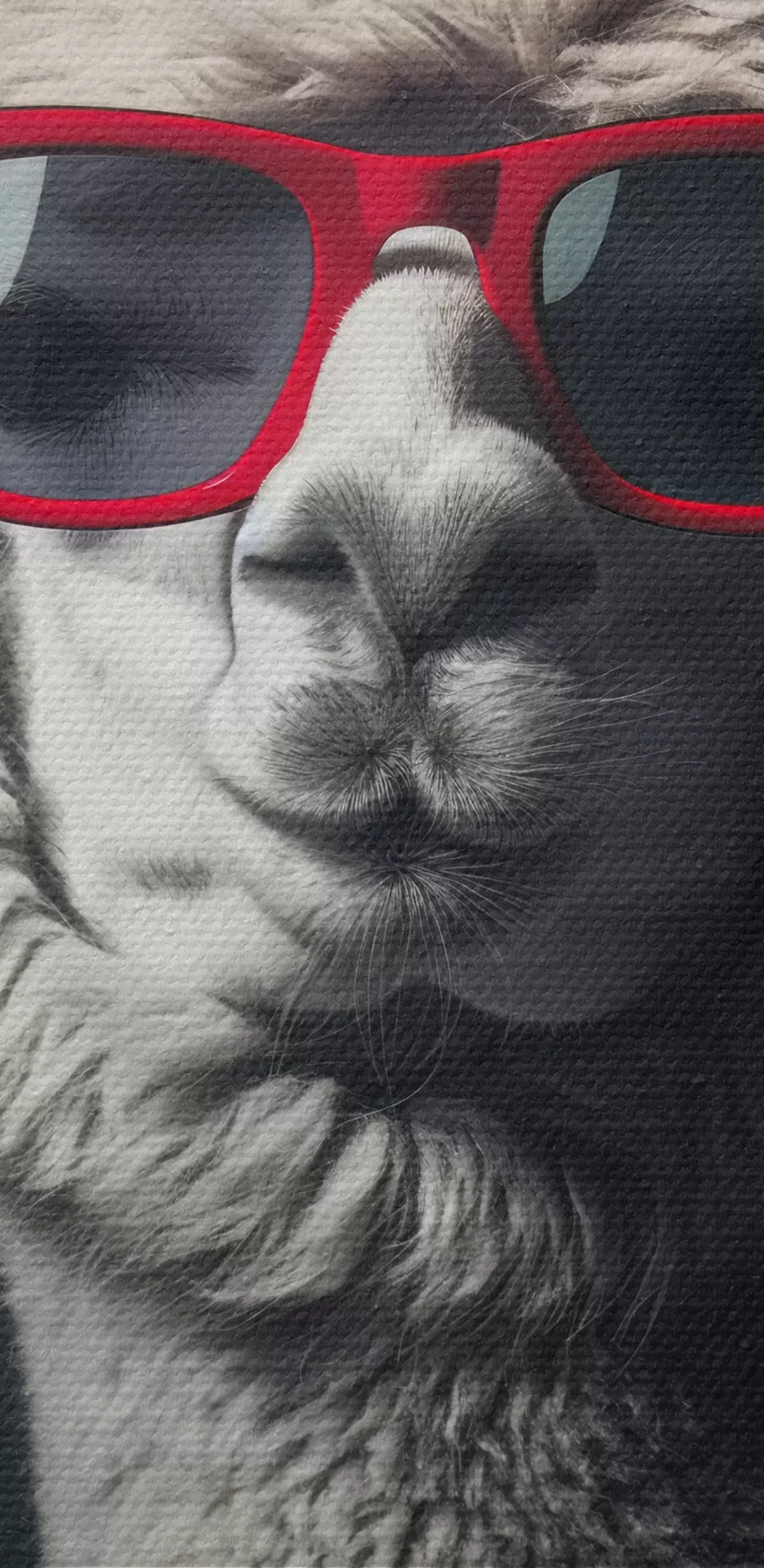 Tableaux rondes Lama gris avec des lunettes rouges r40996