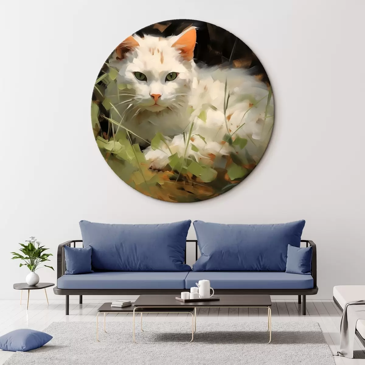 Tableaux rondes Chat blanc couché dans l'herbe, imitation de coups de pinceau Nr r41017