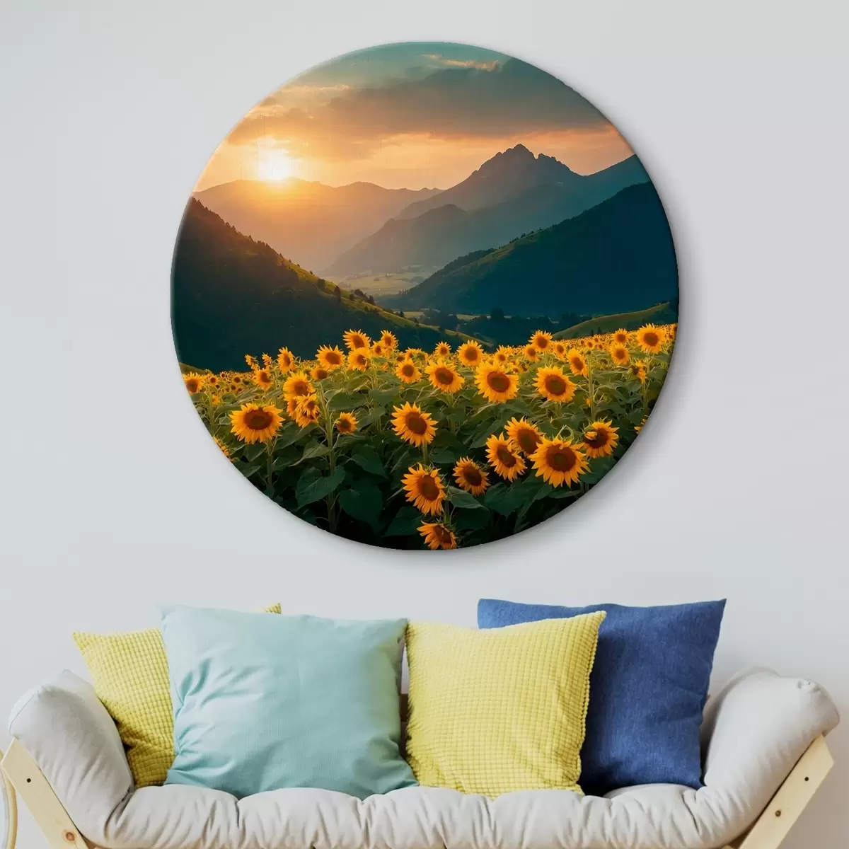 Tableaux rondes Tournesols sur fond de montagnes Nr r41049