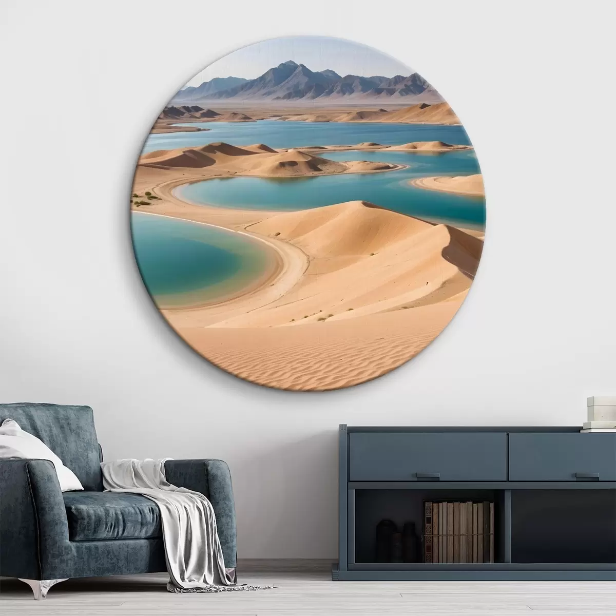 Tableaux rondes Un vaste paysage désertique avec des dunes ondulantes et des lacs turquoise, entouré de montagnes escarpées Nr r41087