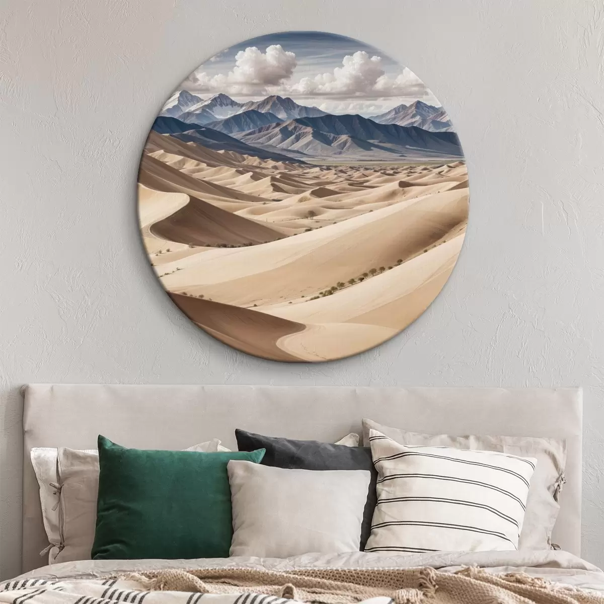 Tableaux rondes Un vaste paysage désertique avec des dunes ondulantes, des montagnes escarpées au loin et un ciel nuageux dramatique Nr r41089