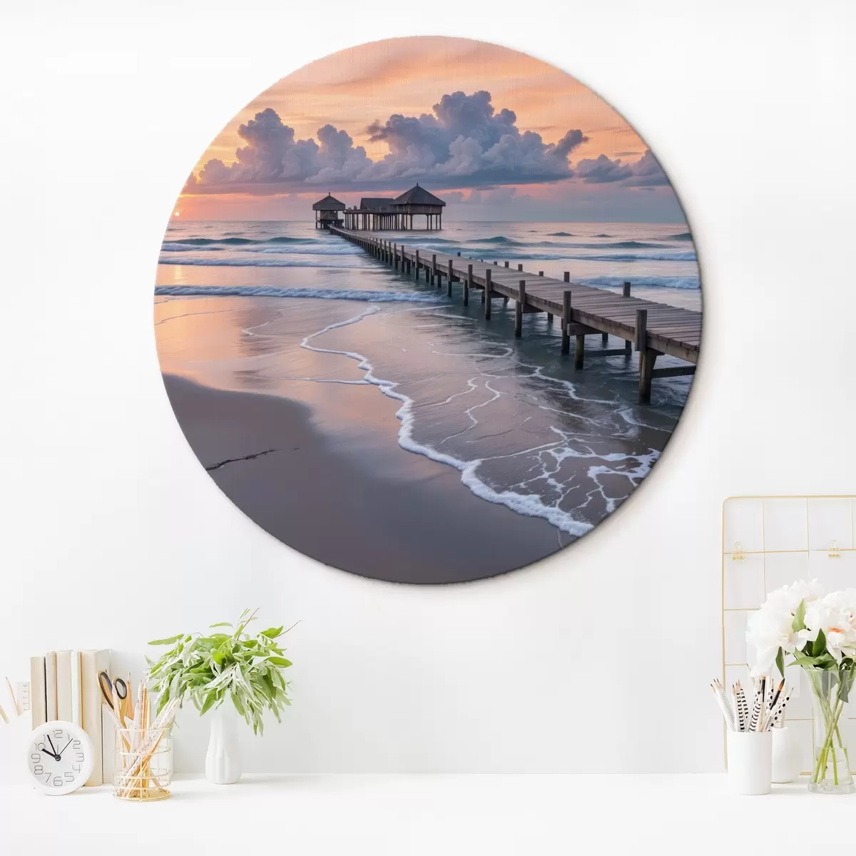 Tableaux rondes Jetée en bois surplombant l'océan calme au coucher du soleil avec des nuages colorés r41091