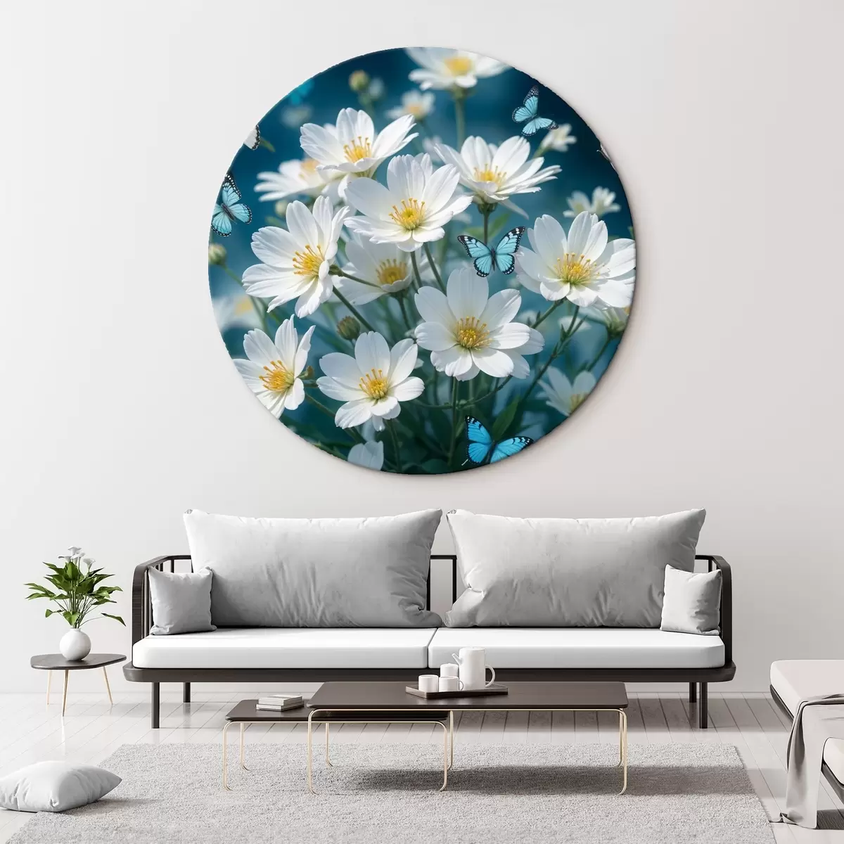 Tableaux rondes Un champ de fleurs de marguerites blanches avec des papillons bleus voletant entre elles sur un fond bleu flou r41096