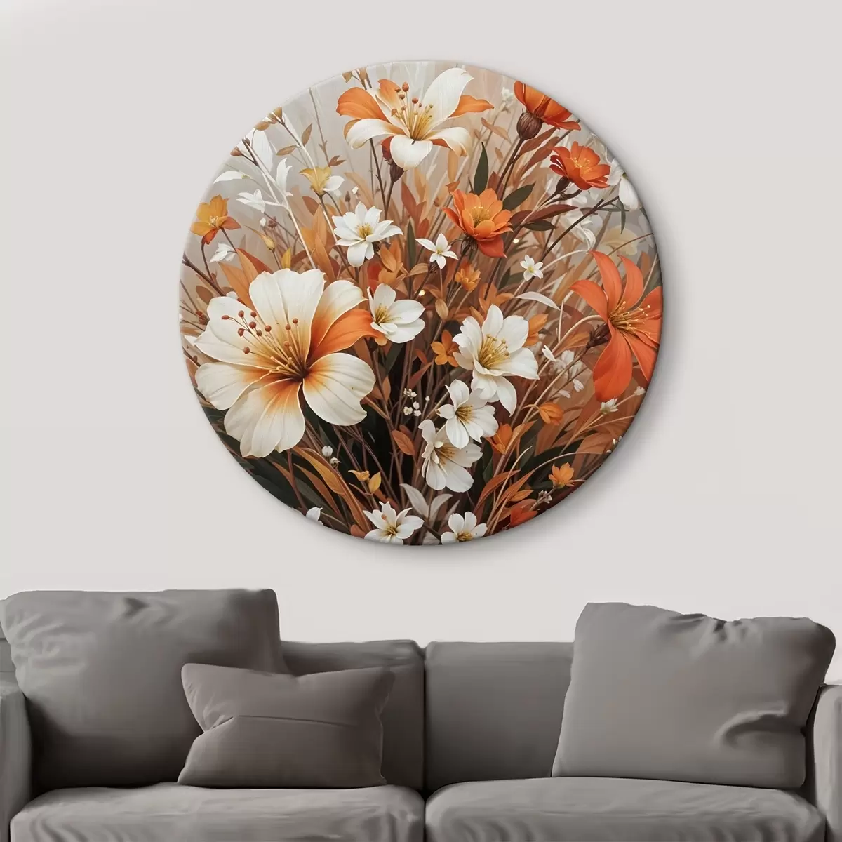 Tableaux rondes Un bouquet vibrant de fleurs orange et blanches, comprenant des lys et d'autres fleurs délicates Nr r41099