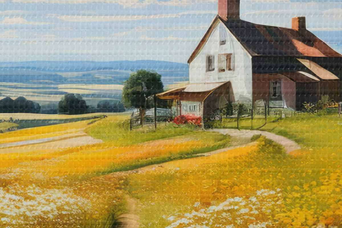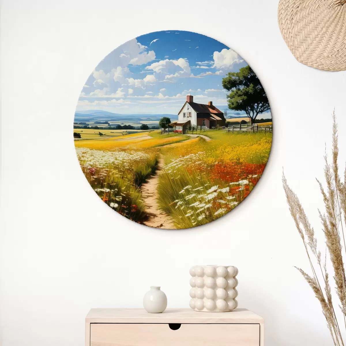 Tableaux rondes chemin dans un champ fleuri et maison r41109