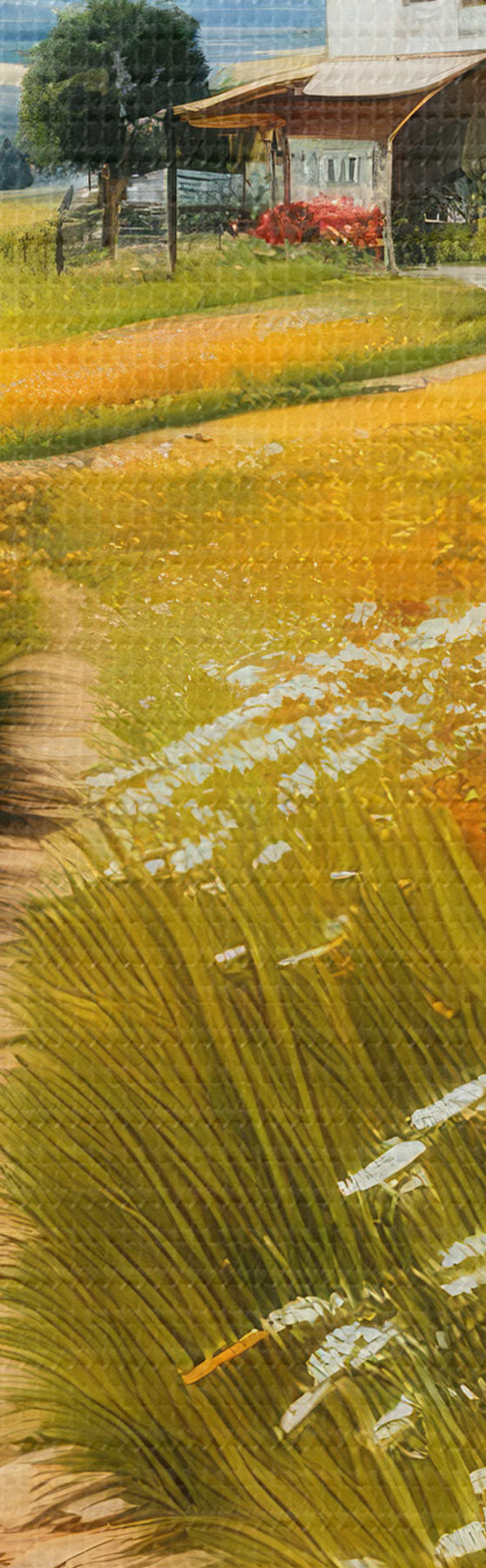 Tableaux rondes chemin dans un champ fleuri et maison Nr r41109