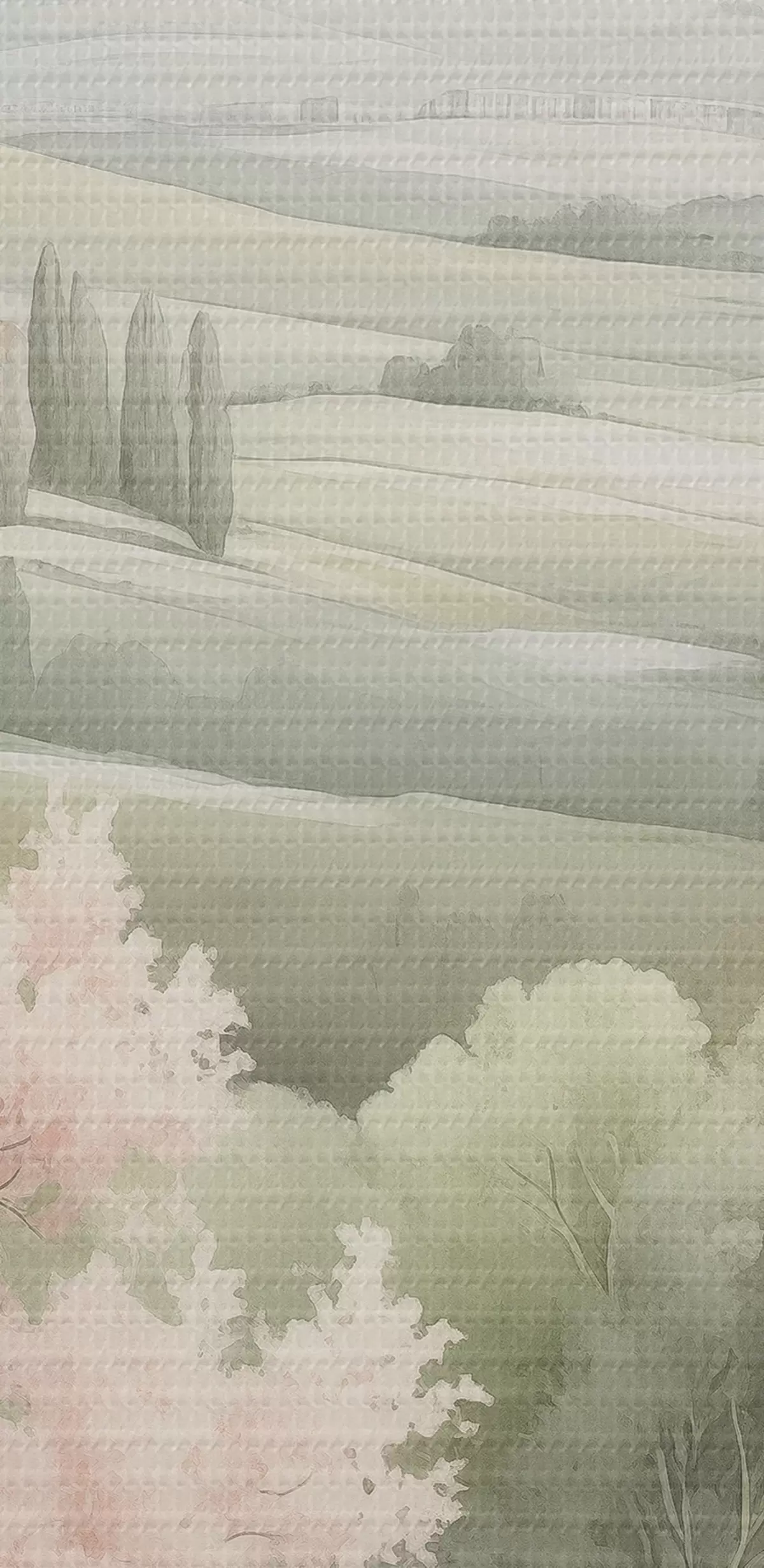 Tableaux rondes Aquarelle nature, couleurs délicates, roses, arbres, collines vertes r41223