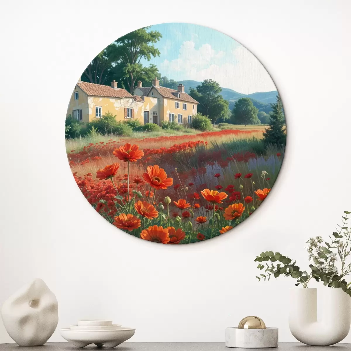 Tableaux rondes Un champ de coquelicots d'un rouge éclatant au premier plan, avec une rangée de charmantes maisons jaunes et blanches à l'arrière-plan Nr r41260