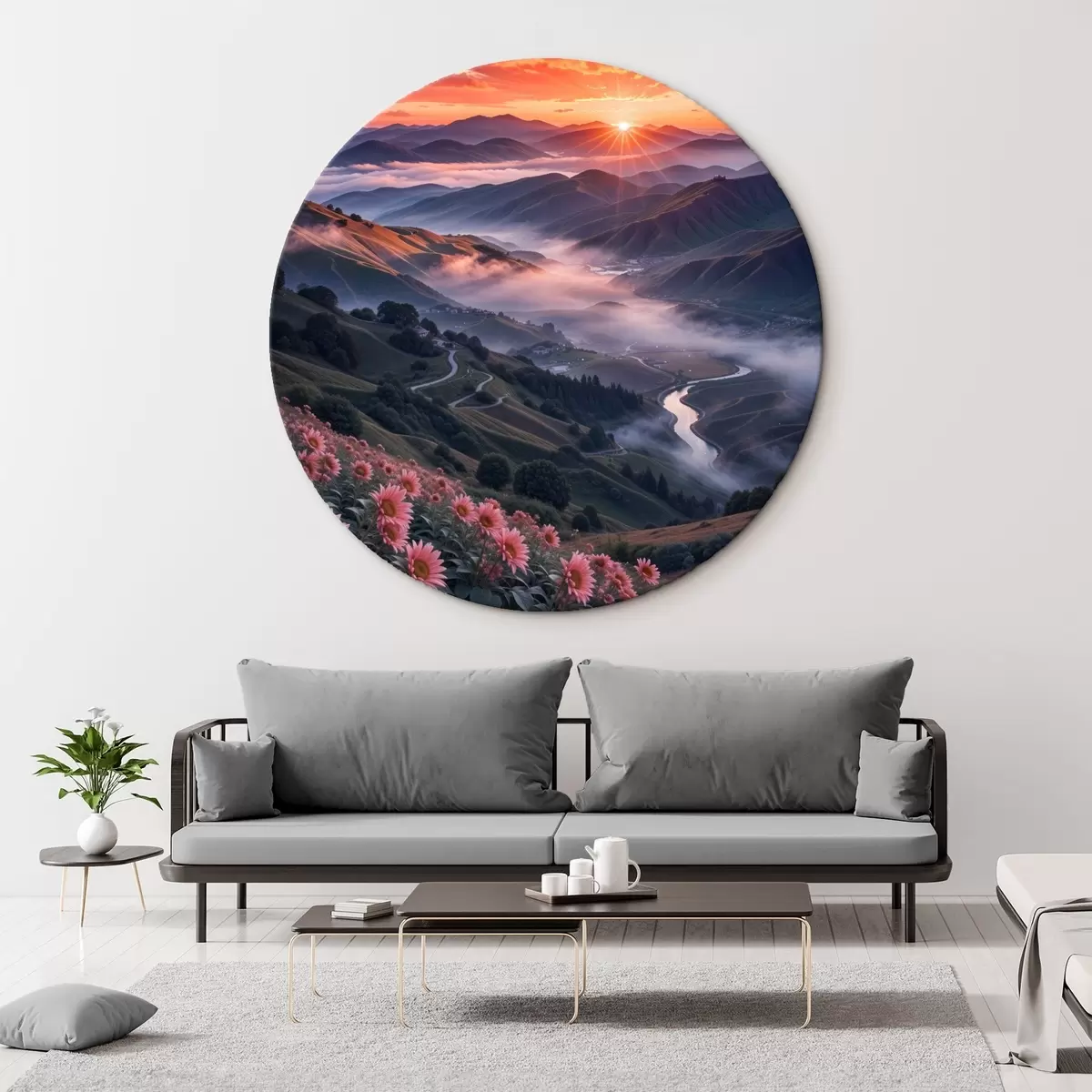 Tableaux rondes Paysage à couper le souffle avec un coucher de soleil éclatant sur une région montagneuse avec des grappes de fleurs roses r41263