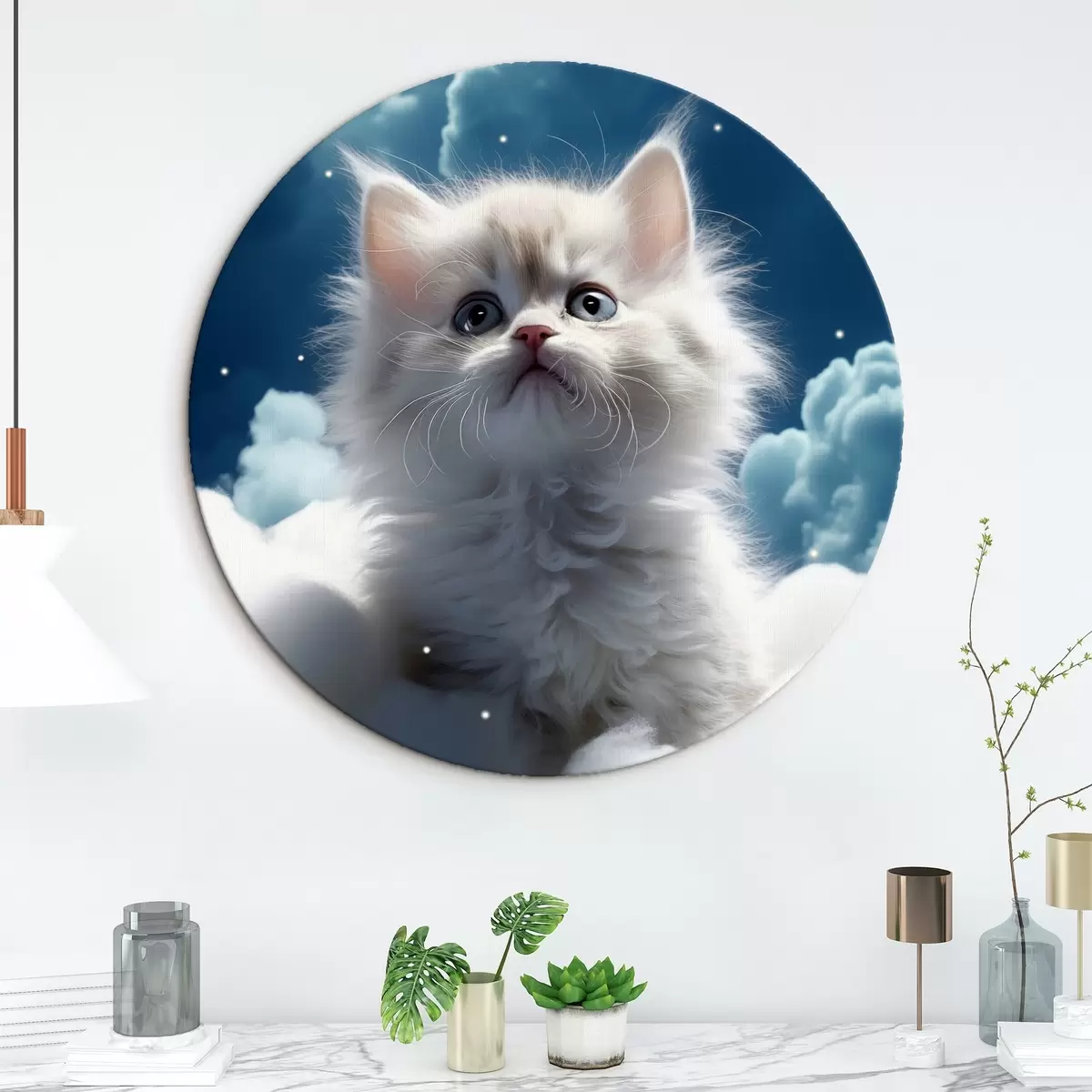 Tableaux rondes Un chaton blanc et pelucheux dans le ciel est assis sur un nuage Nr r41279
