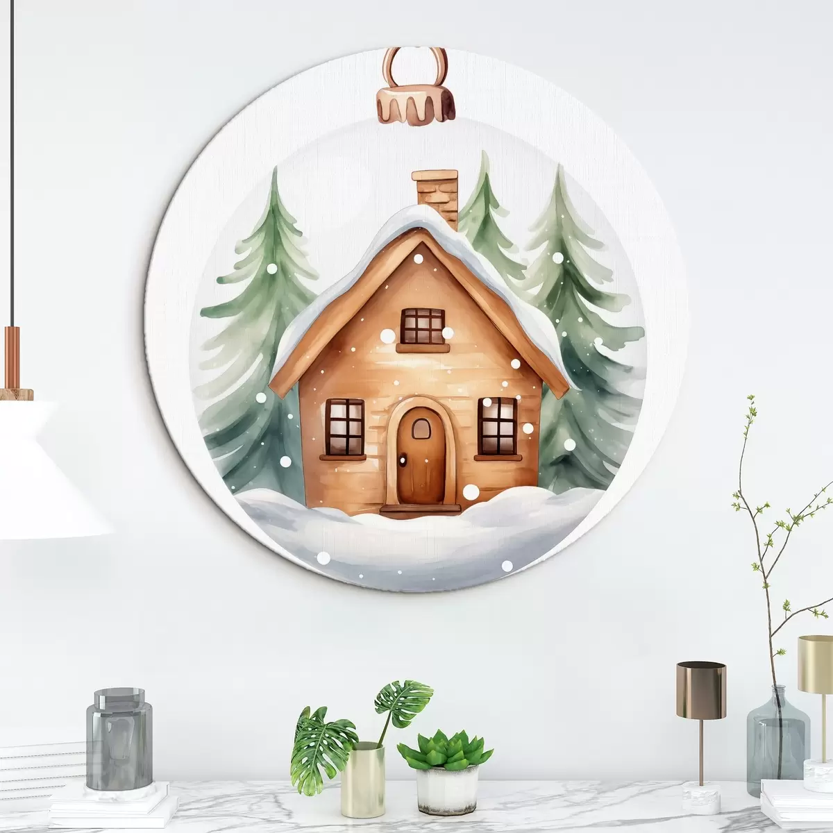 Tableaux rondes Boule de cristal avec maison aquarelle dans la neige, pins r41362