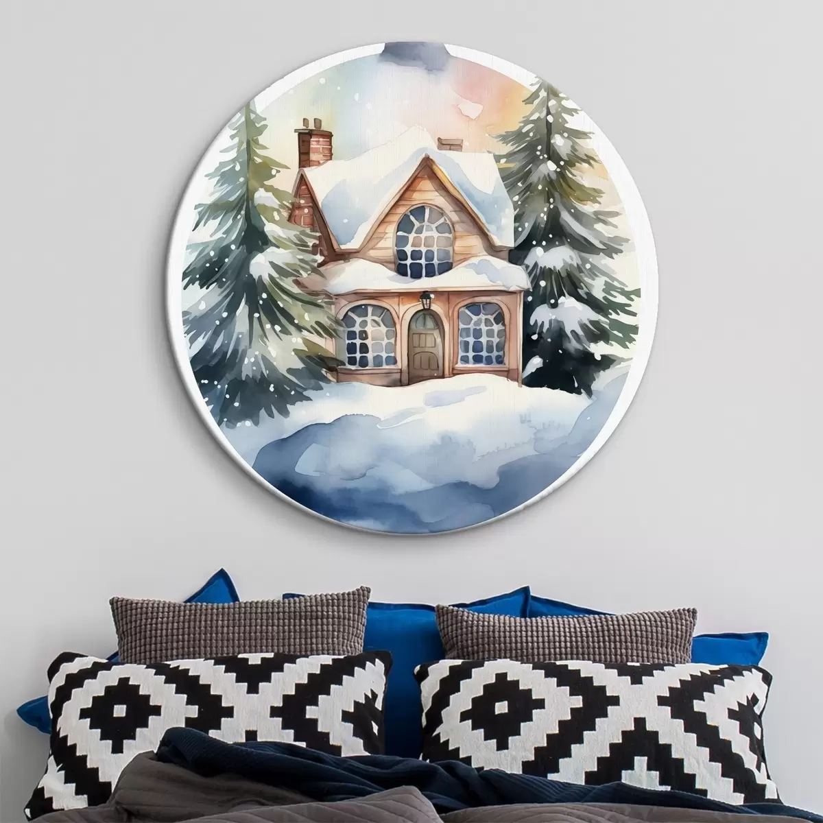 Tableaux rondes Boule décorative de Noël avec une maison de neige et des sapins en aquarelle Nr r41363