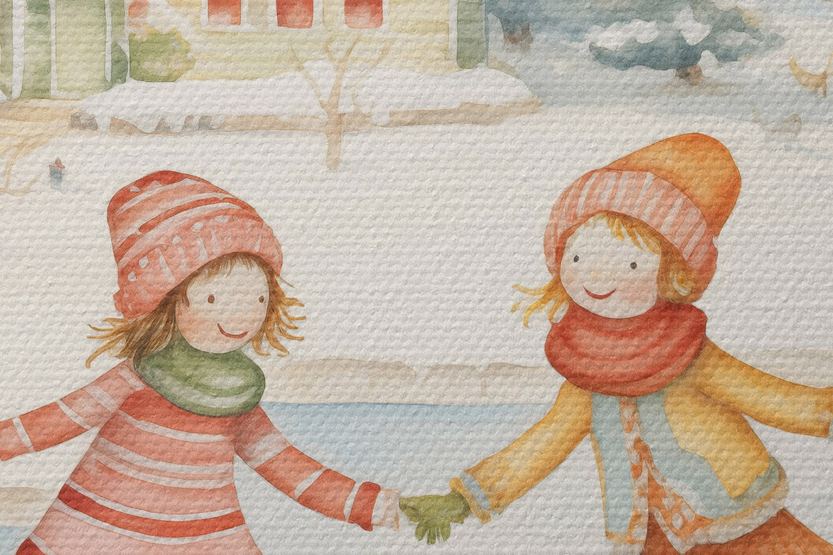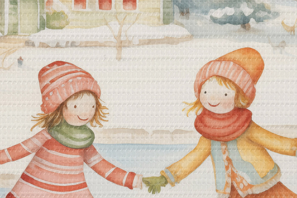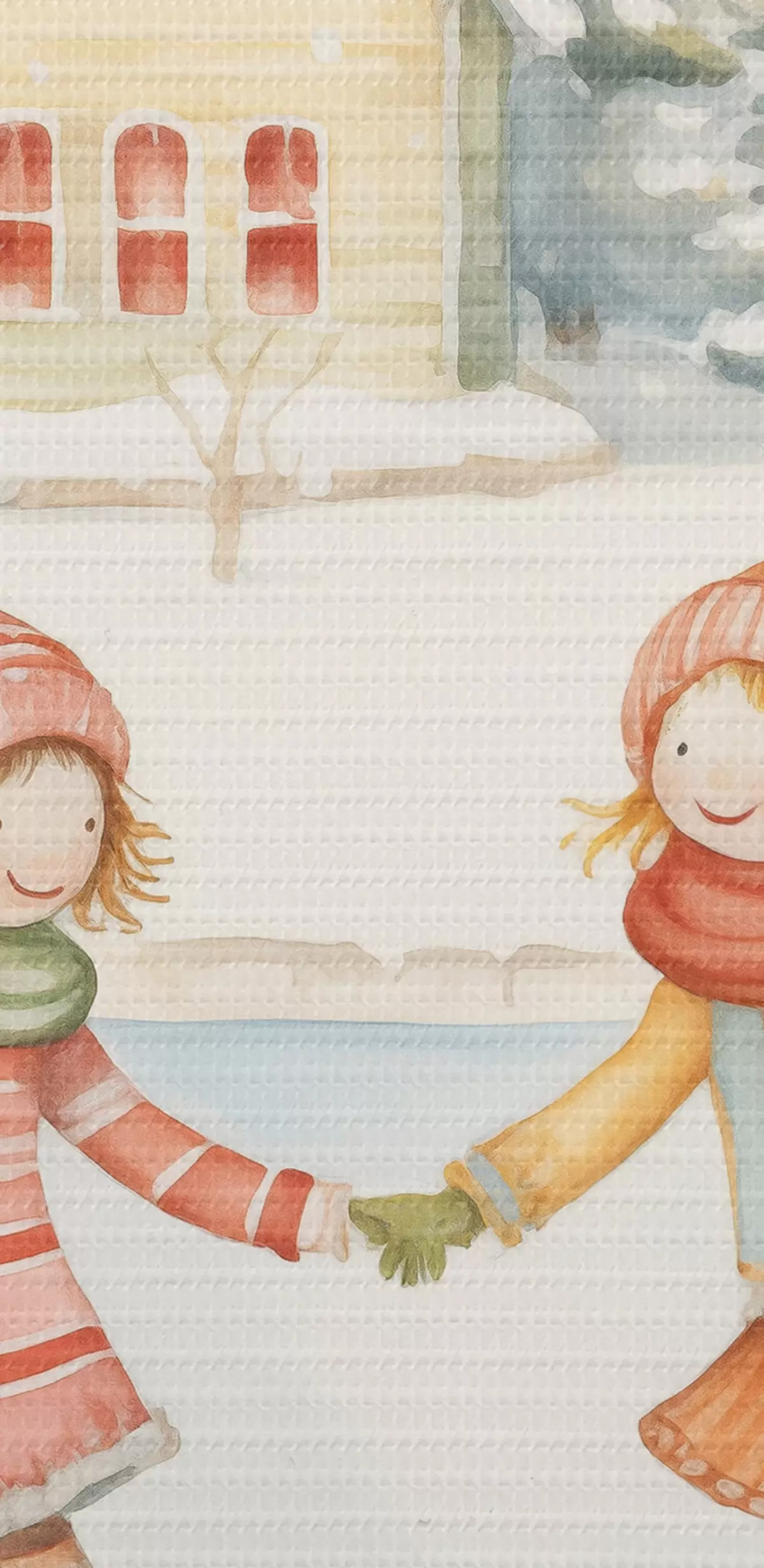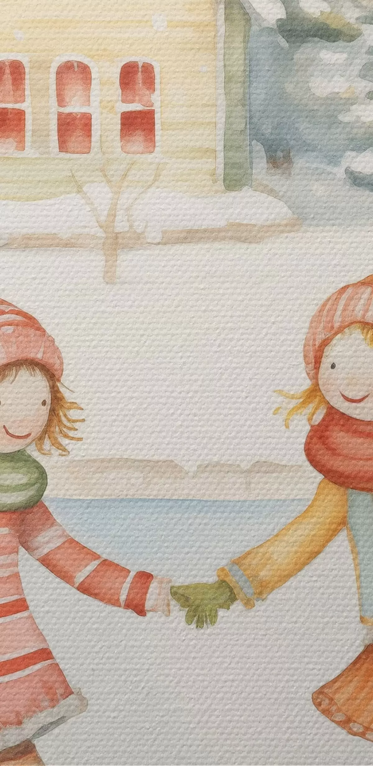 Tableaux rondes Scène d'hiver avec deux filles patinant, ville d'hiver, maisons, forêt r41377