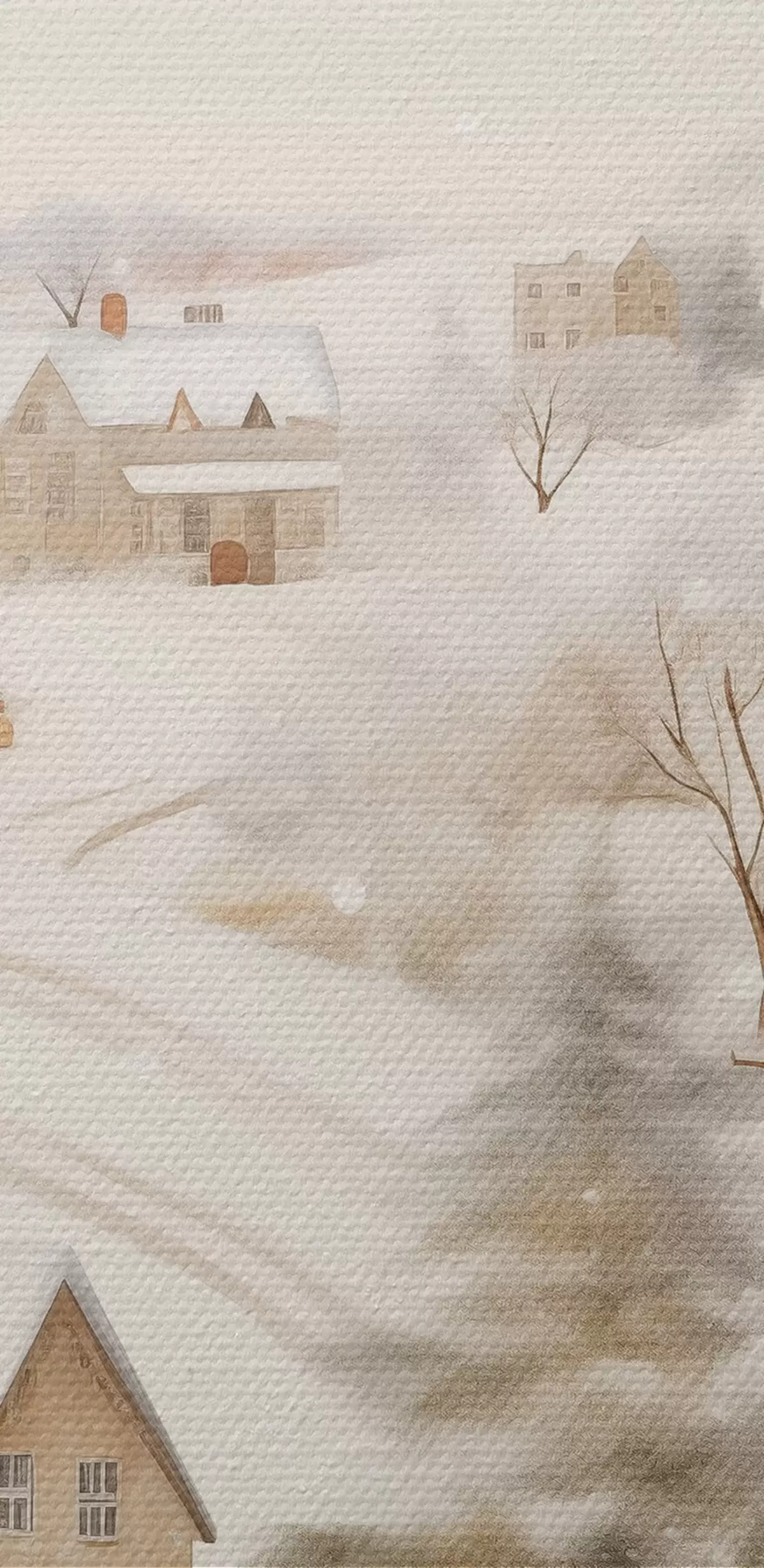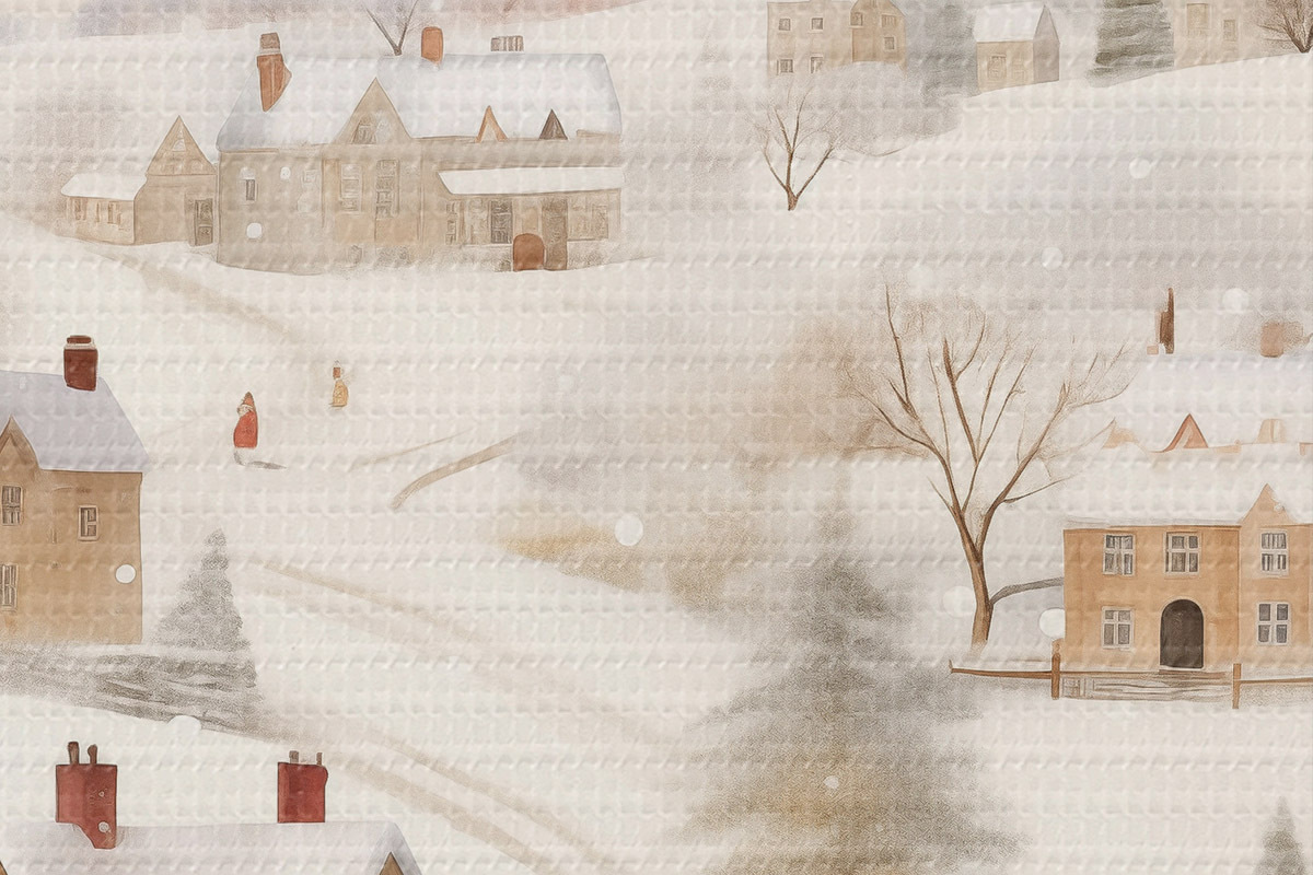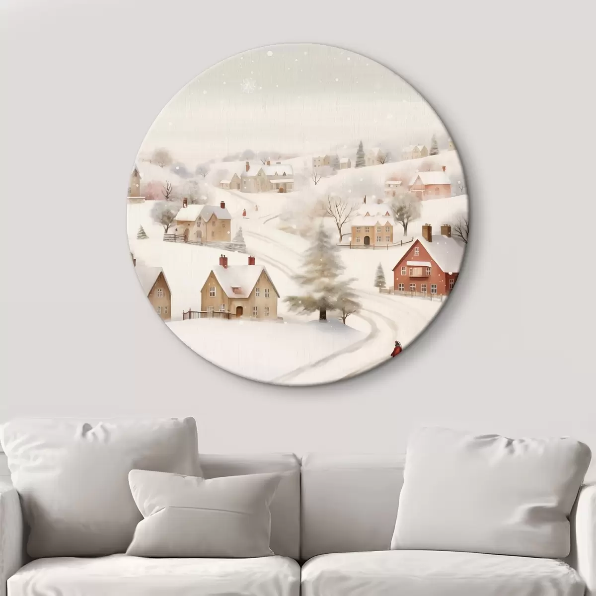 Tableaux rondes Village d'hiver, aquarelle, flocons de neige, couleurs douces, arbres, paysage r41381