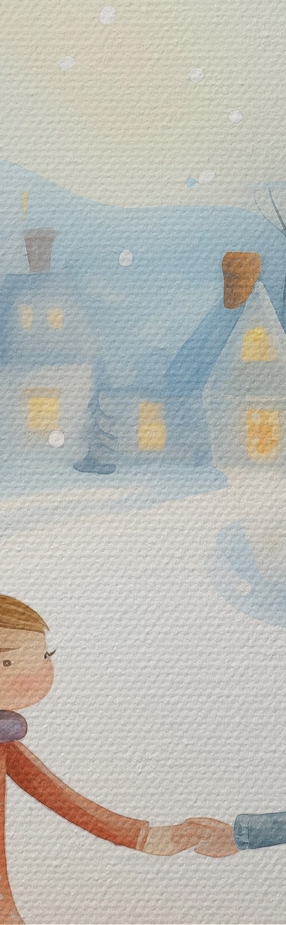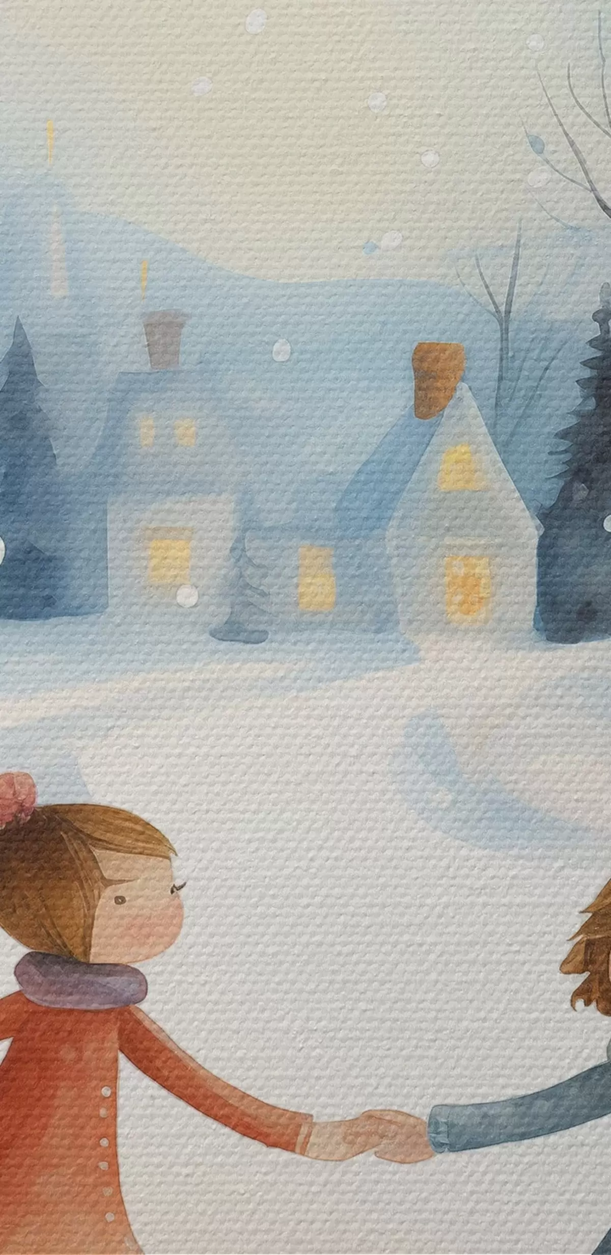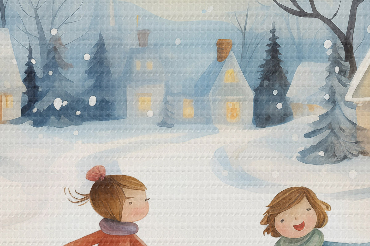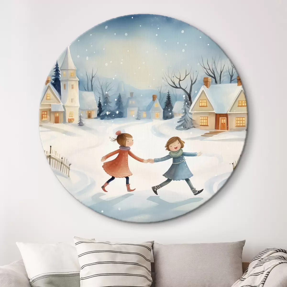 Tableaux rondes Filles dans le village d'hiver, flocons de neige, aquarelle, maisons, forêt r41385