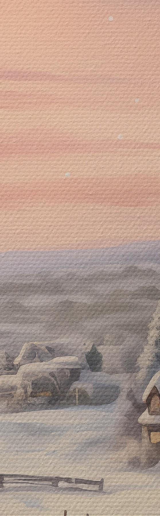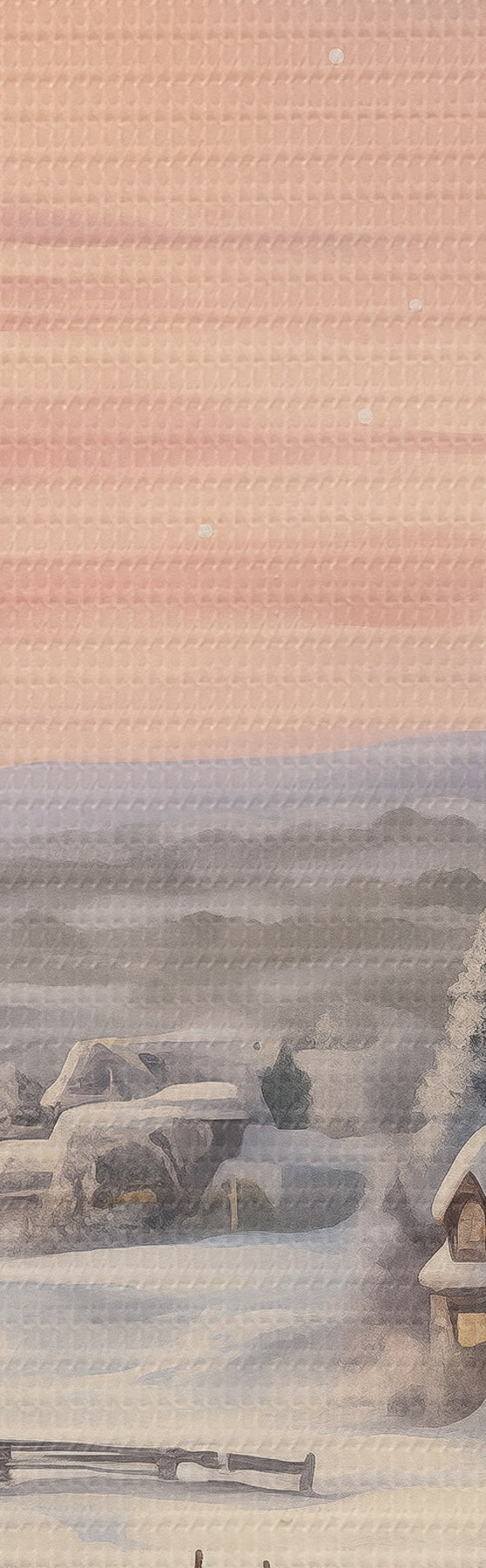 Tableaux rondes Coucher de soleil dans le village d'hiver, rustique, aquarelle, flocons de neige Nr r41386