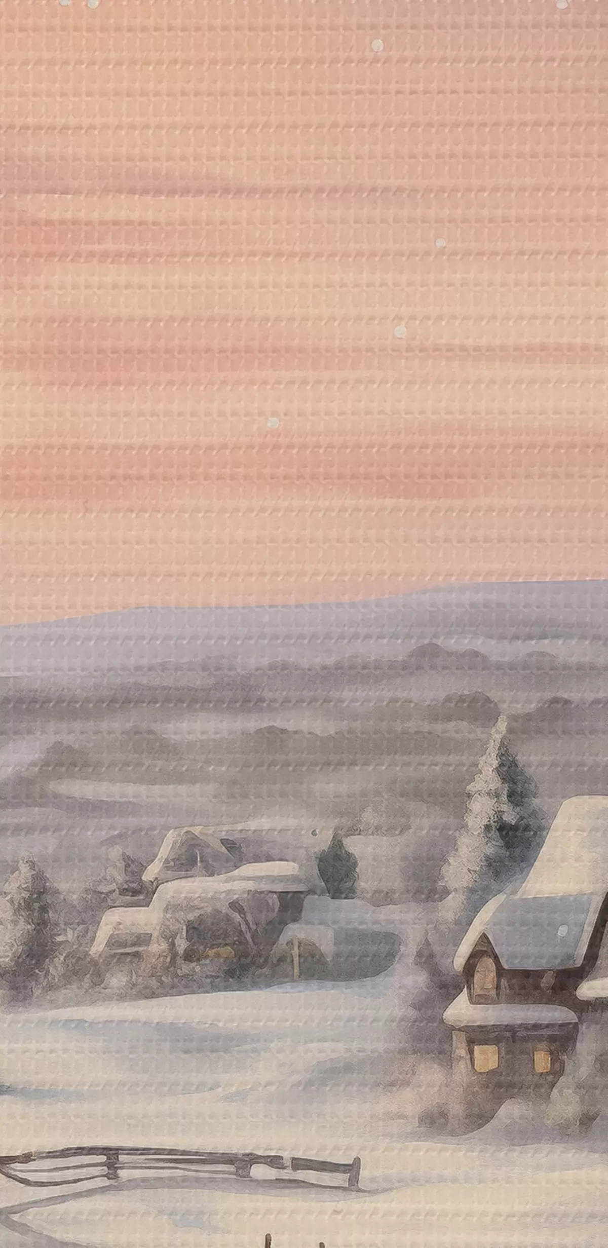 Tableaux rondes Coucher de soleil dans le village d'hiver, rustique, aquarelle, flocons de neige r41386
