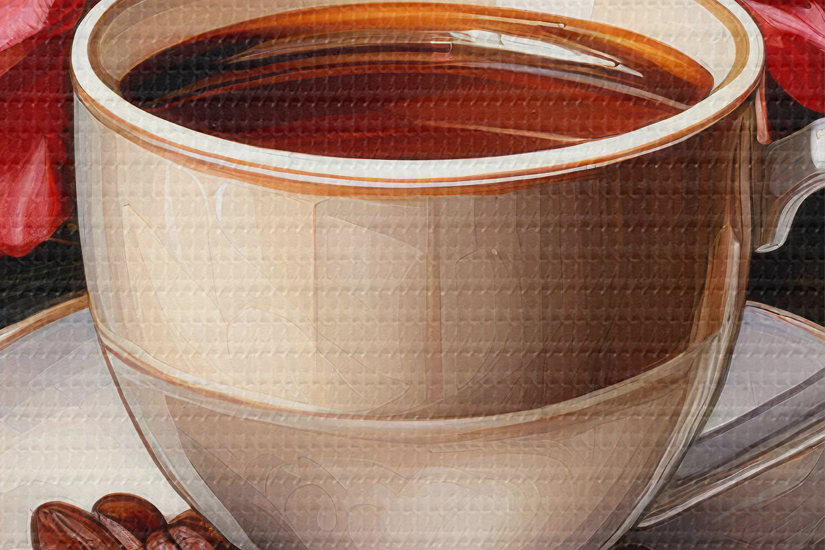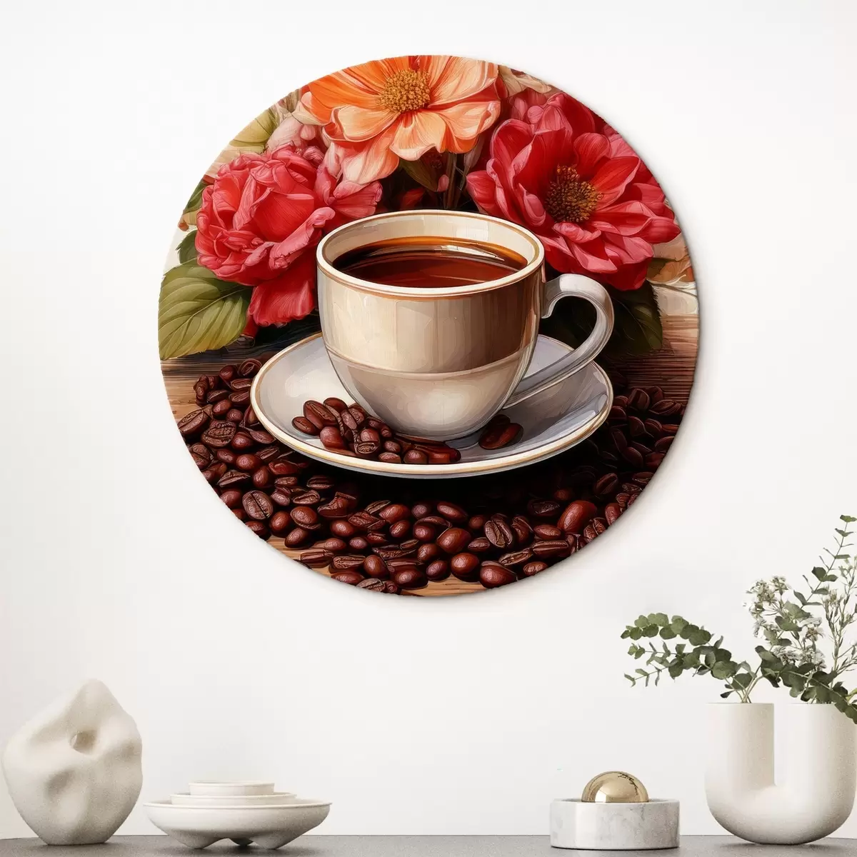 Tableaux rondes une tasse de café et un bouquet de fleurs Nr r41411