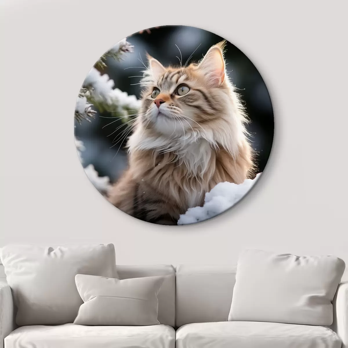 Tableaux rondes Un chat roux pelucheux est assis près de la neige sur un fond sombre Nr r41435